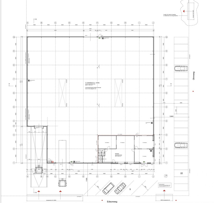 * De bedrijfshal van ca. 1.779 m2 excl. kantoor en incl. terrein met parkeervoorziening van ca. 1.200 m2