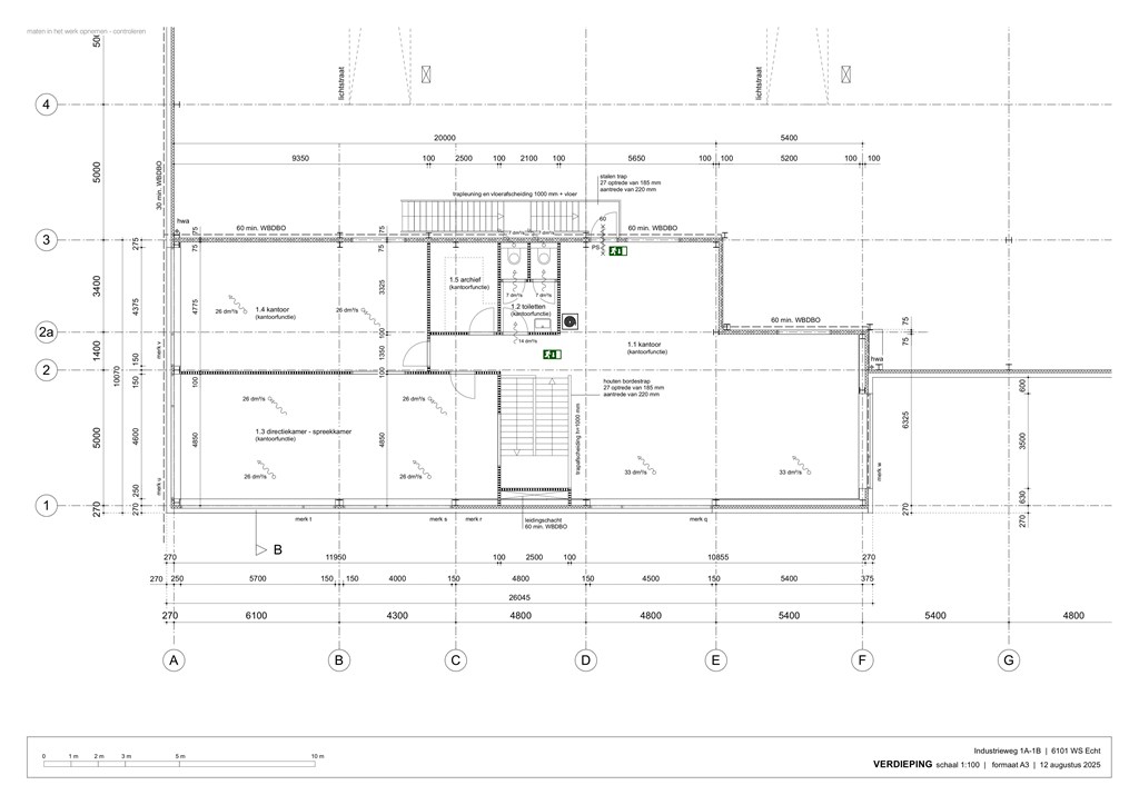 overloop/werkruimte, 3 riante kantoren, vergaderruimte, toiletgroep (dames- en herentoilet met voorportaal), archiefruimte.