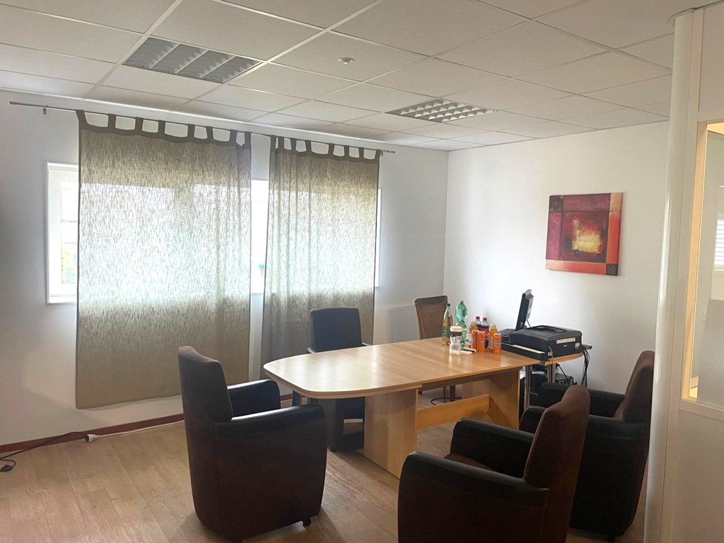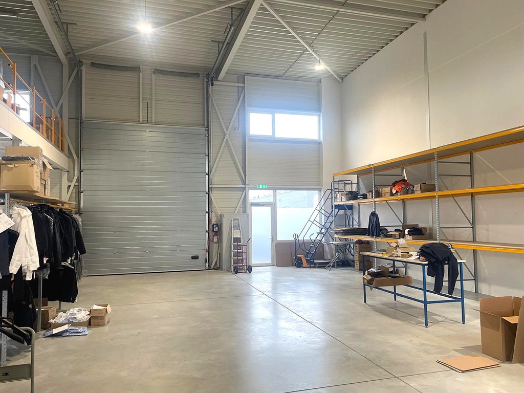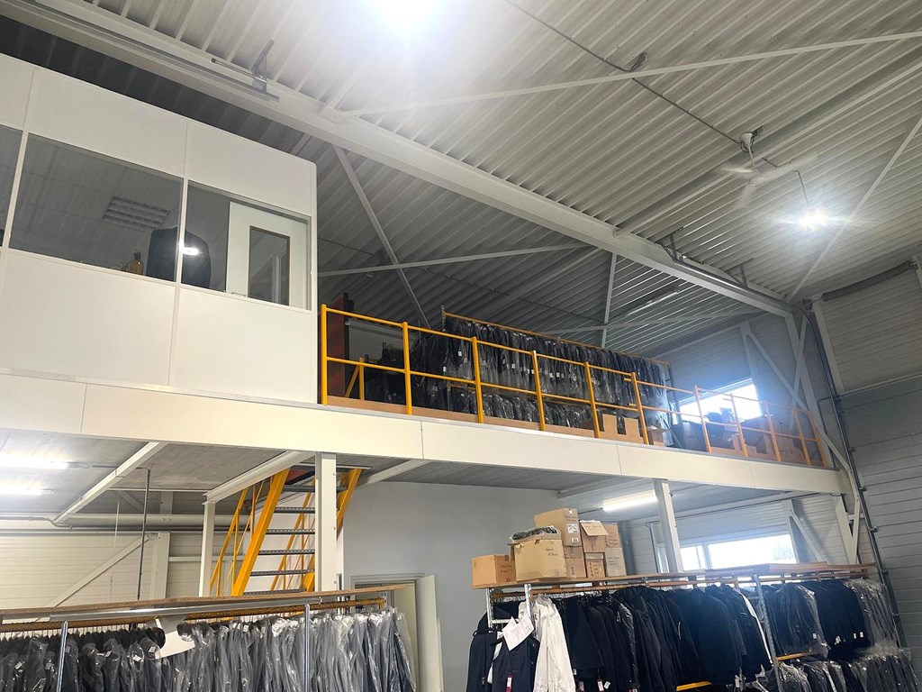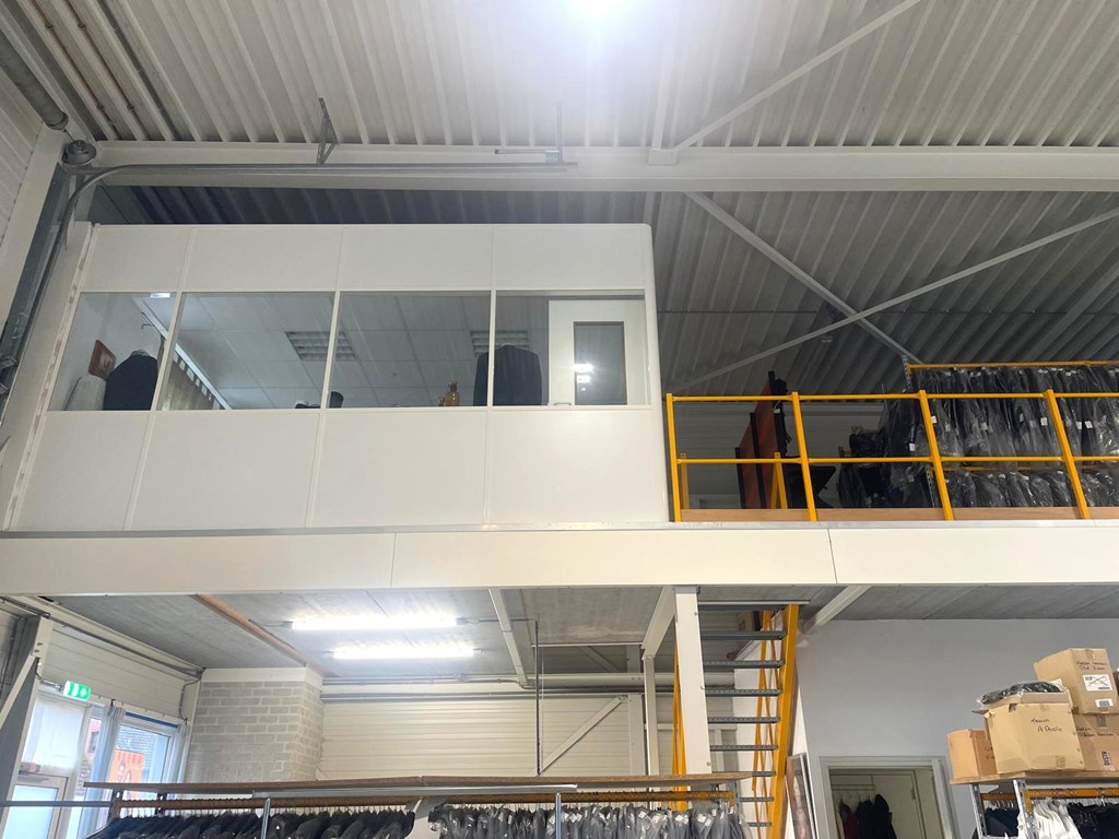 Kantoor (20 m²) met laminaatvloer, magazijn (44 m²).
