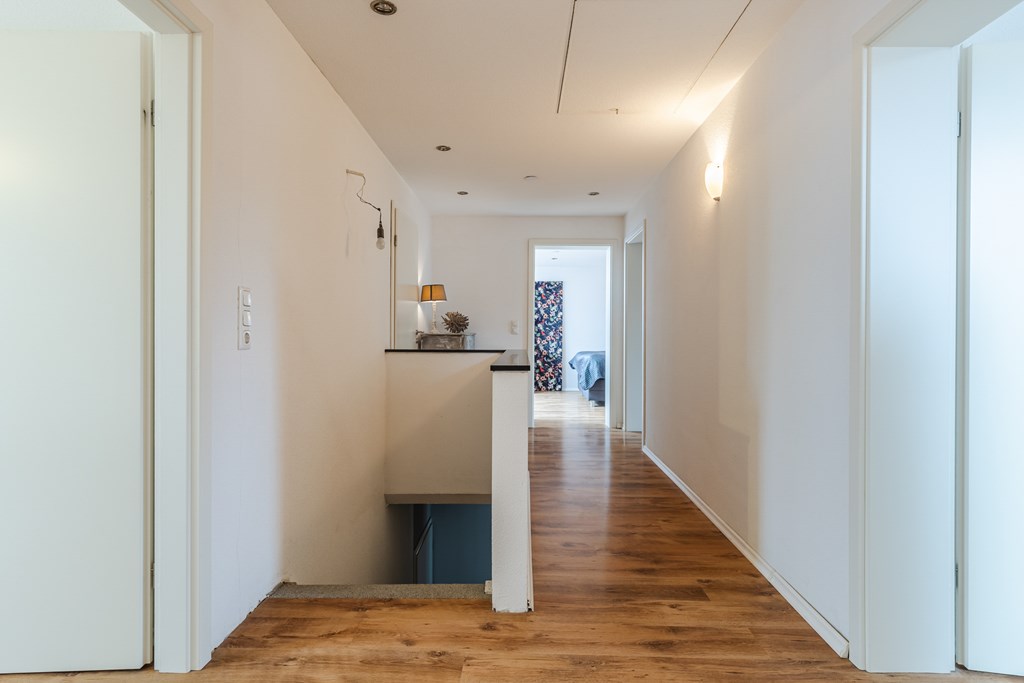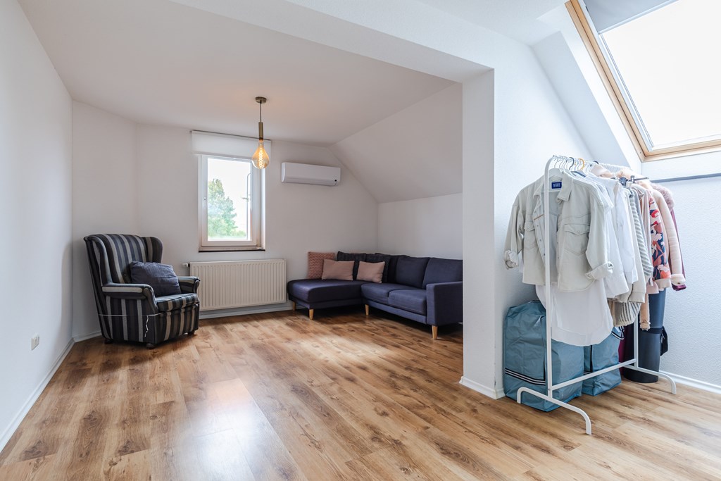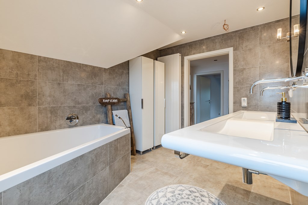 De eerste verdieping is afgewerkt met een moderne laminaatvloer en beschikt over 4 royale slaapkamers (31 m², 21 m², 21 m² en 13 m²), een luxe badkamer (13 m²) met ligbad, inloopdouche, dubbele wastafel en een zwevend toilet en een zolder (68 m²).