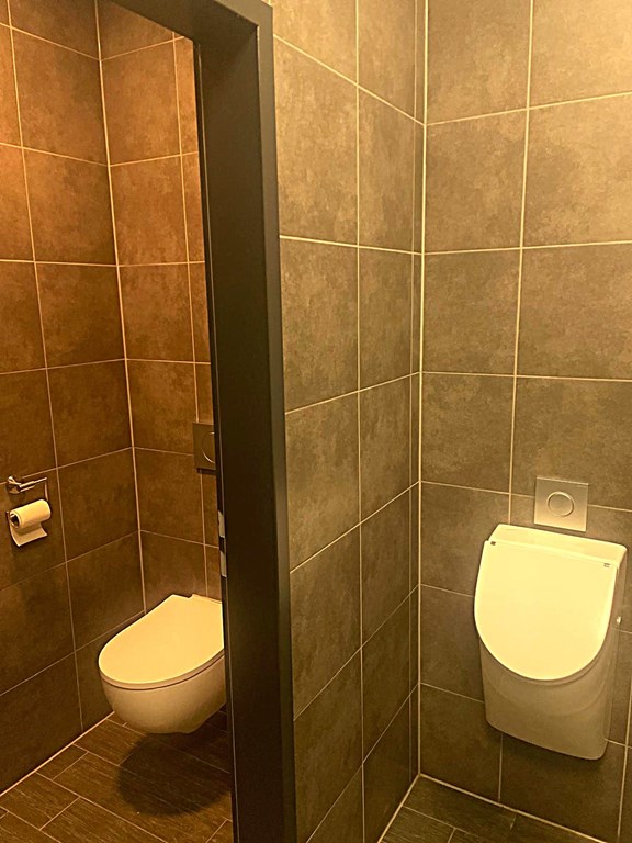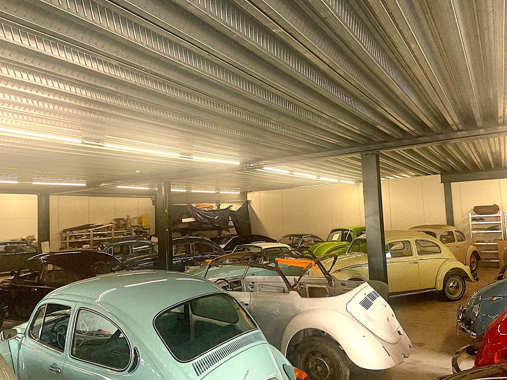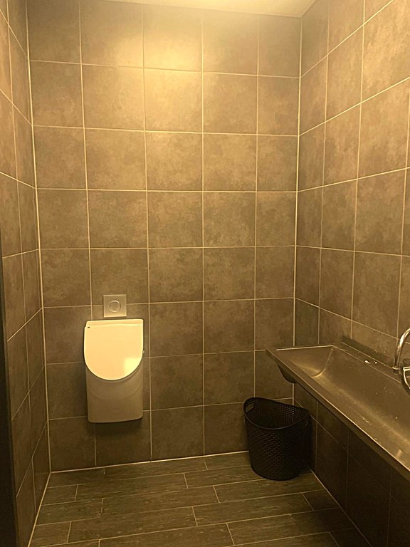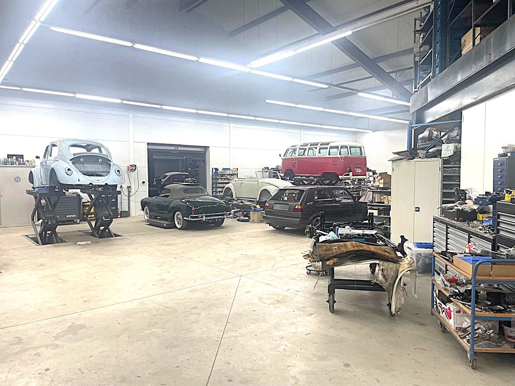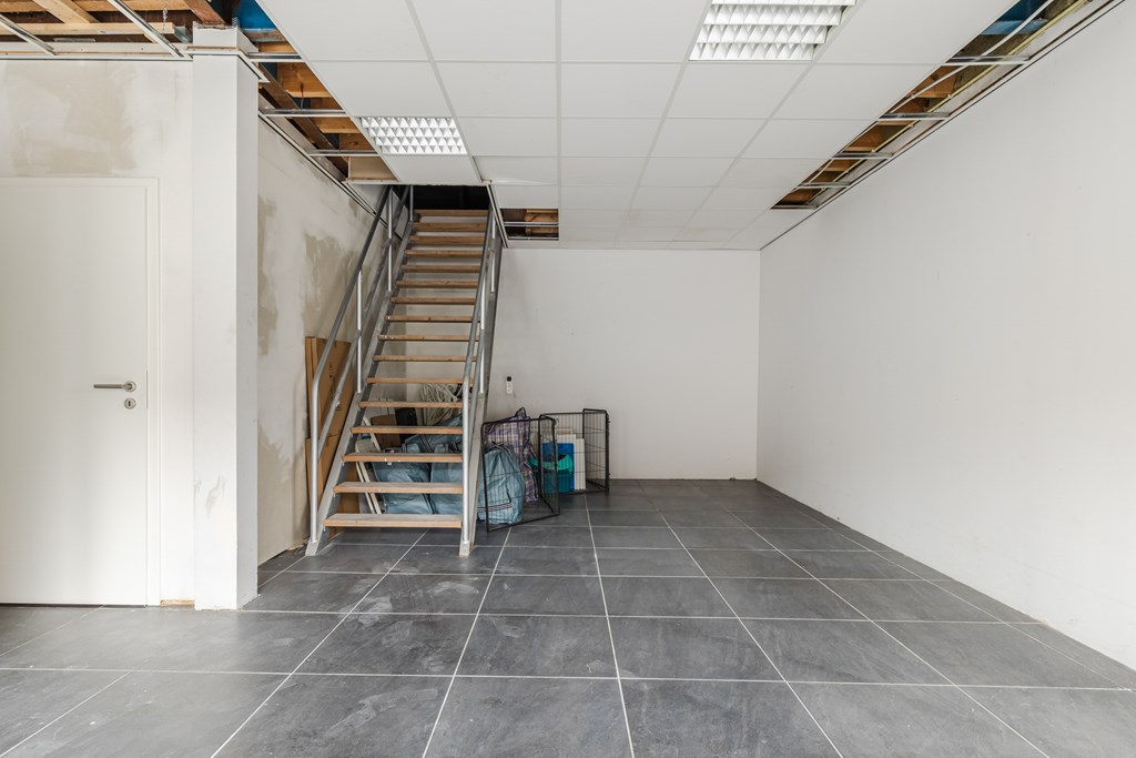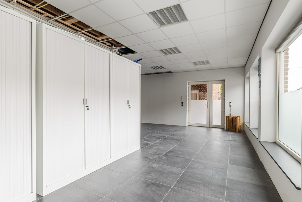 Kantoor (27 m²) met pvc-vloer en airconditioning, toiletgroep (7 m²) met een zwevend toilet, urinoir en stalen wasbak, kantine (14 m²), showroom (266 m²), bedrijfshal (ca. 900 m², verdeeld in 2 units), half open stalling (176 m²).