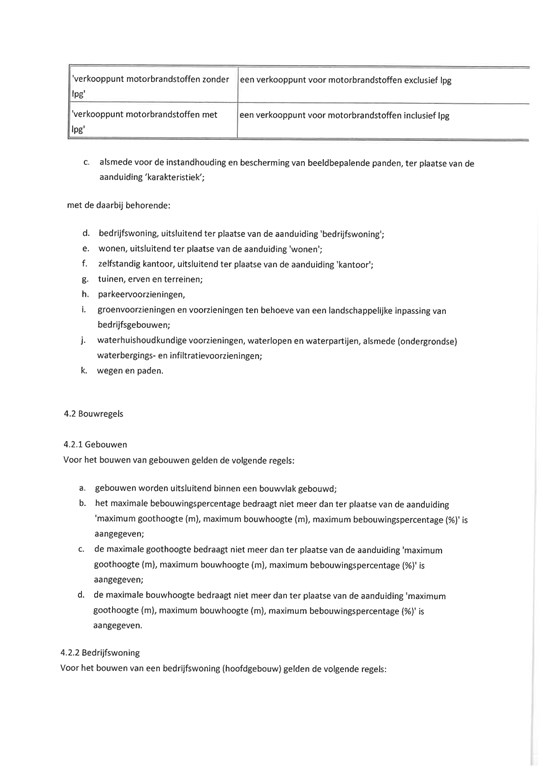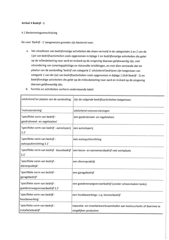 Het perceel is aldus bestemd voor het uitoefenen van bedrijfsmatige activiteiten die staan vermeld in de categorieën 1 en 2 van de Lijst van bedrijfsactiviteiten. Daarnaast zijn de functieaanduidingen “bedrijfswoning” en “specifieke vorm van bedrijf-autospuitinrichting 3.1” van toepassing.