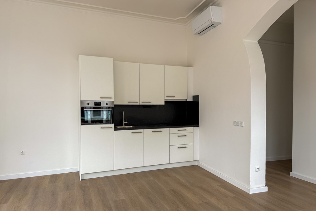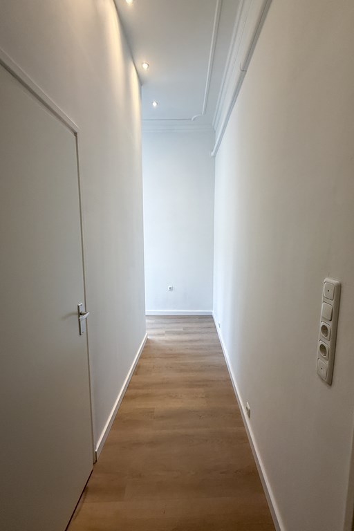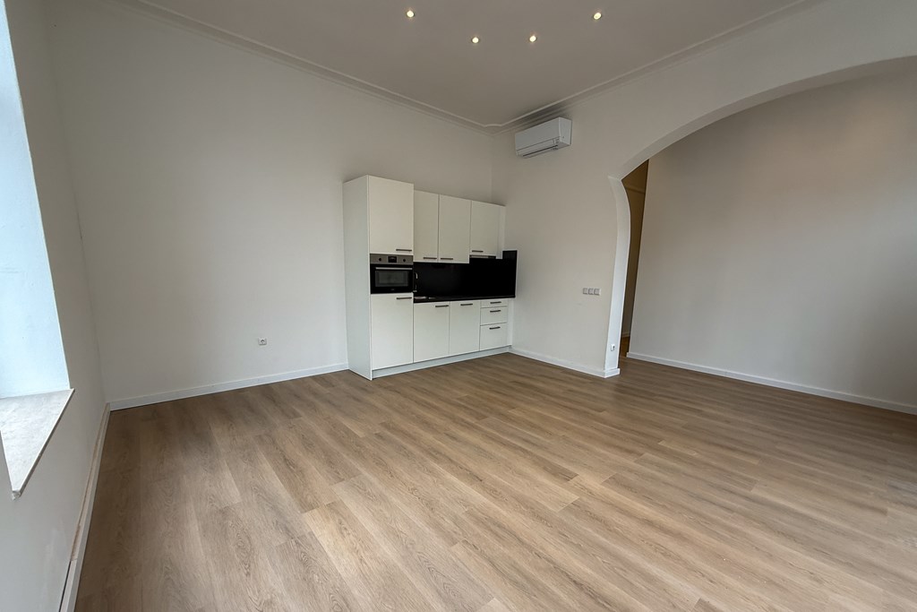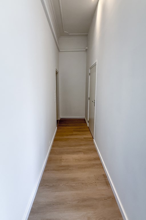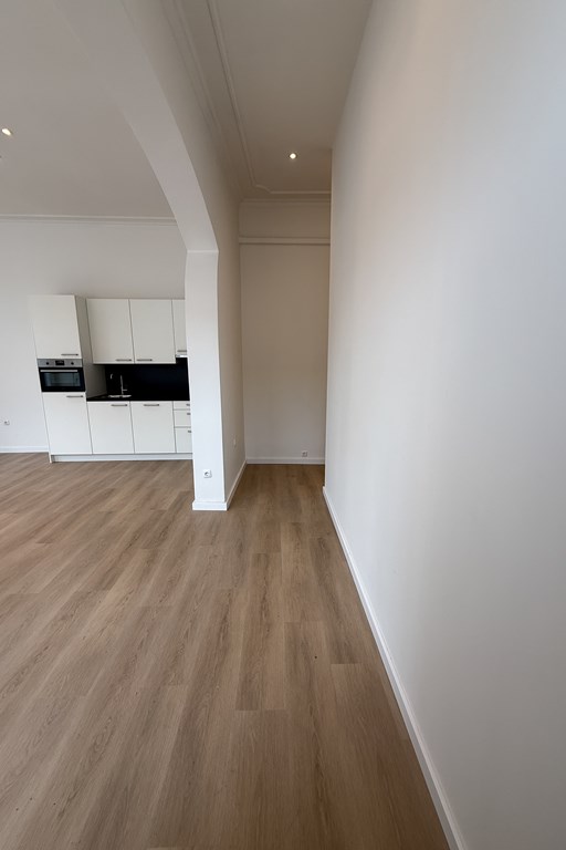 strak afgewerkt, lichte materialen, hoge plafonds en subtiele sierlijsten die een