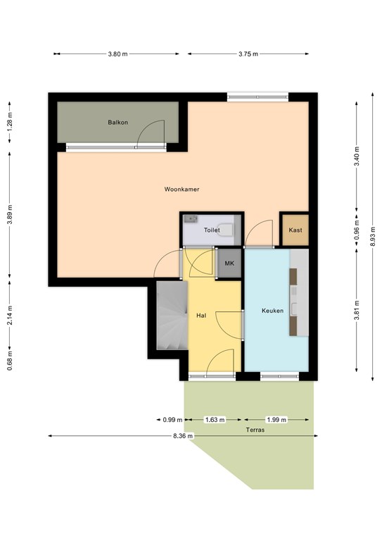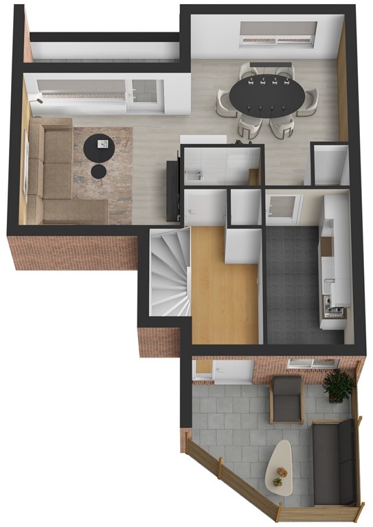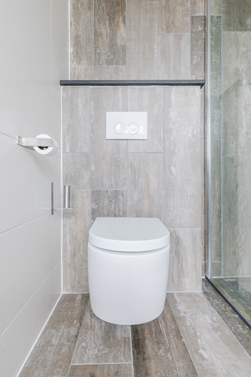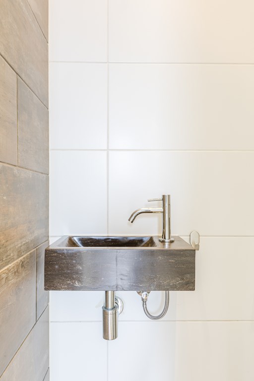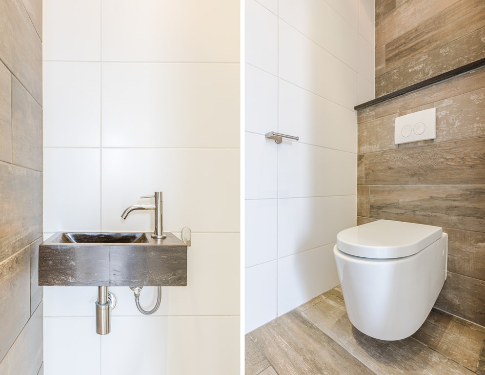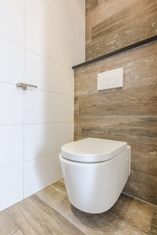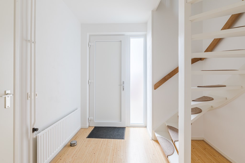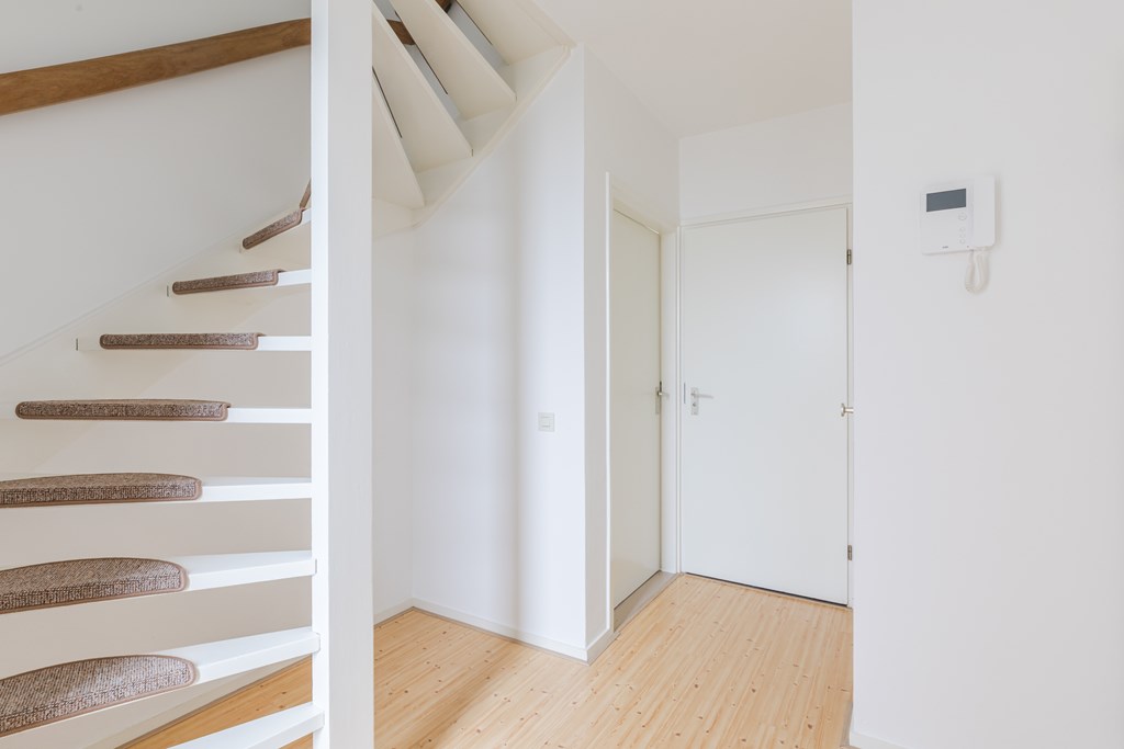 Via het gemeenschappelijke dakterras bereik je het eigen, besloten terras aan de voorzijde (ca. 12 m²), een heerlijke plek voor een kop koffie in de zon. Vanuit hier stap je de woning binnen. De ruime hal (ca. 8 m²) geeft toegang tot het moderne, zwevende toilet met fonteintje, de keuken en de woonkamer.