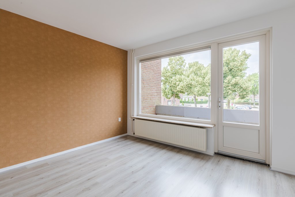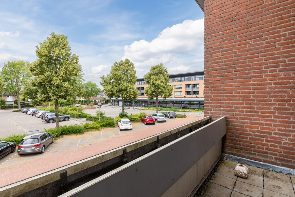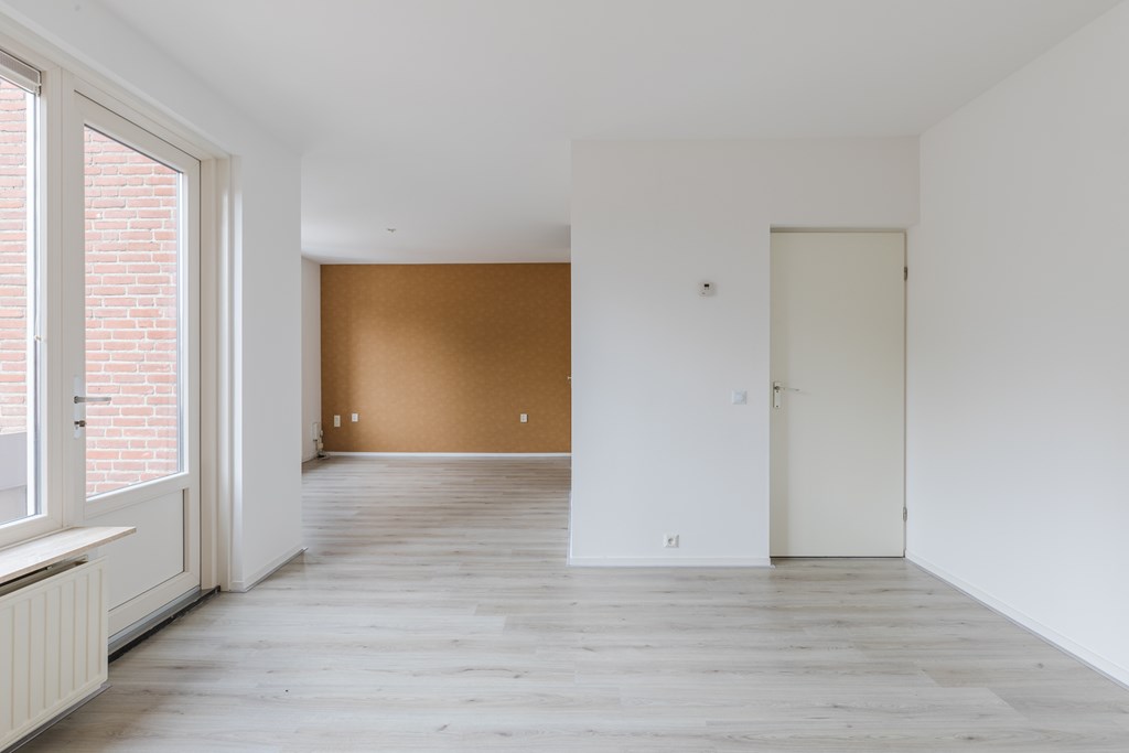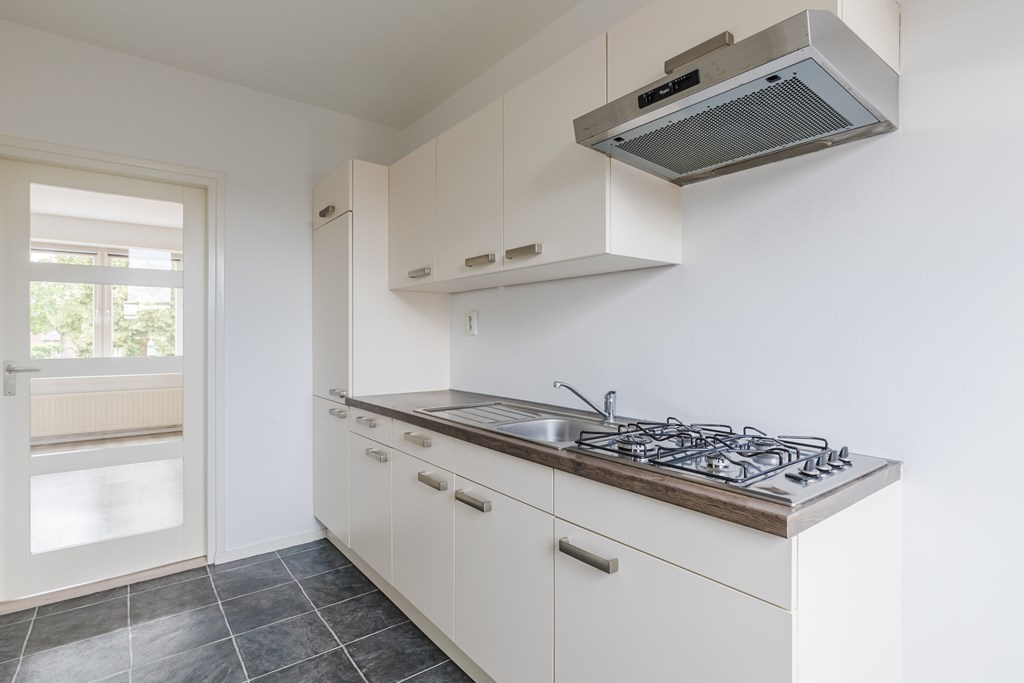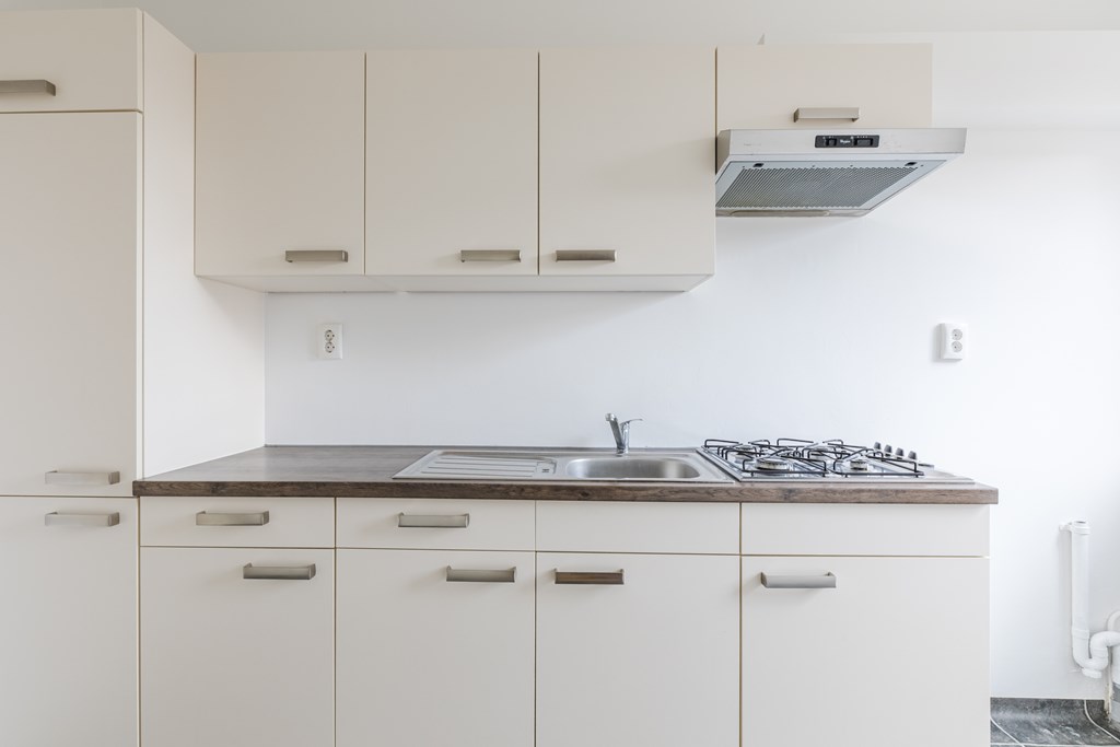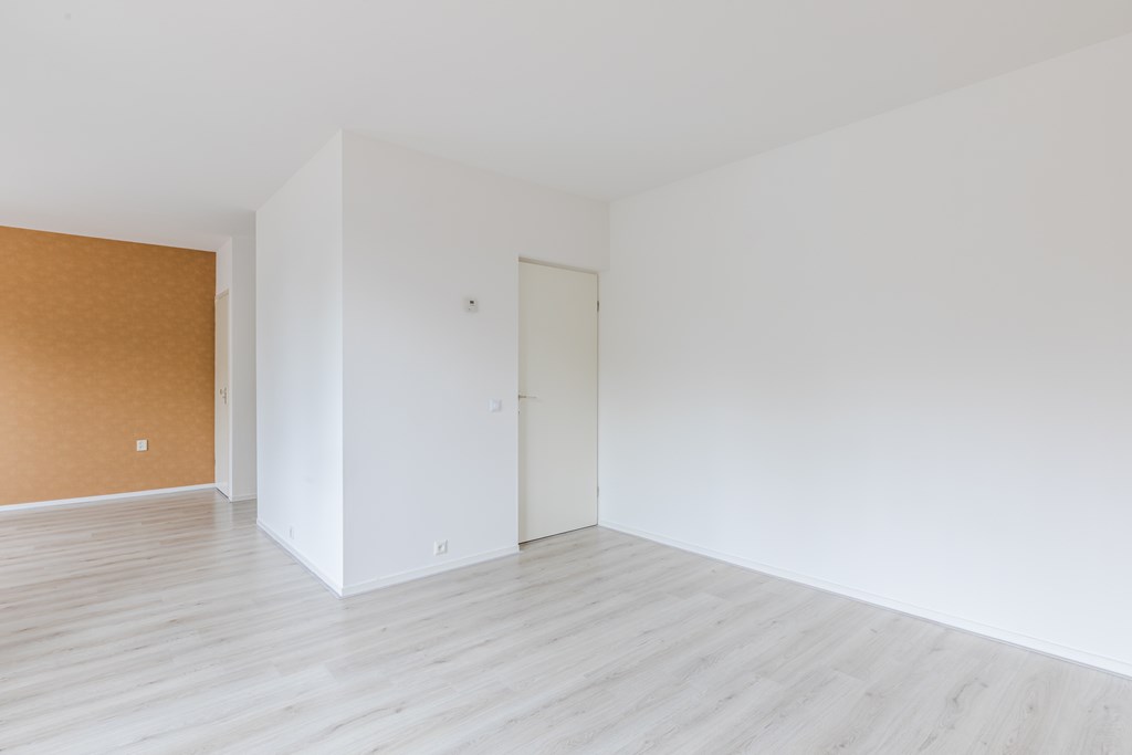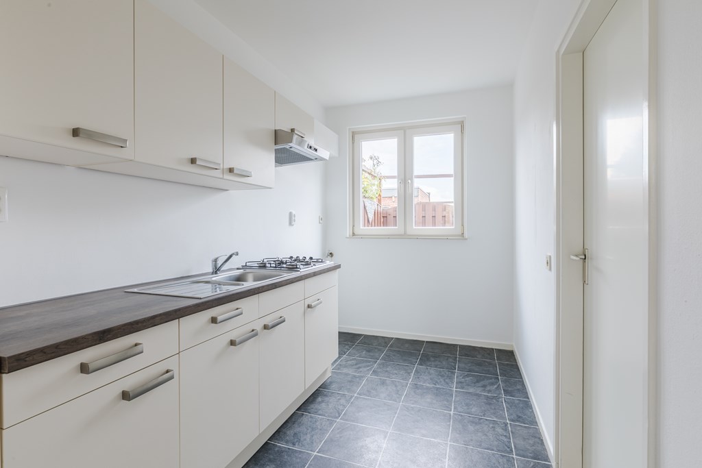 De keuken (ca. 8 m²) is netjes afgewerkt en voorzien van een gasfornuis, afzuigkap en koelkast. De lichte woonkamer (ca. 29 m²) is bereikbaar vanuit zowel de hal als de keuken en biedt toegang tot een fijn balkon (ca. 5 m²) met uitzicht over het chatelainplein.
