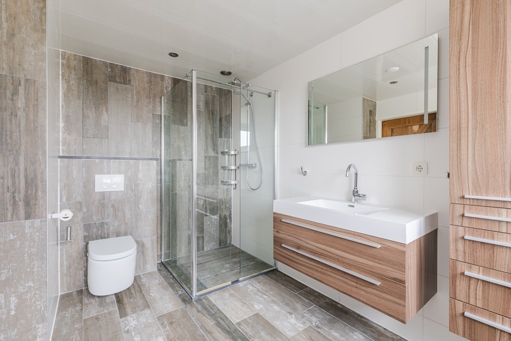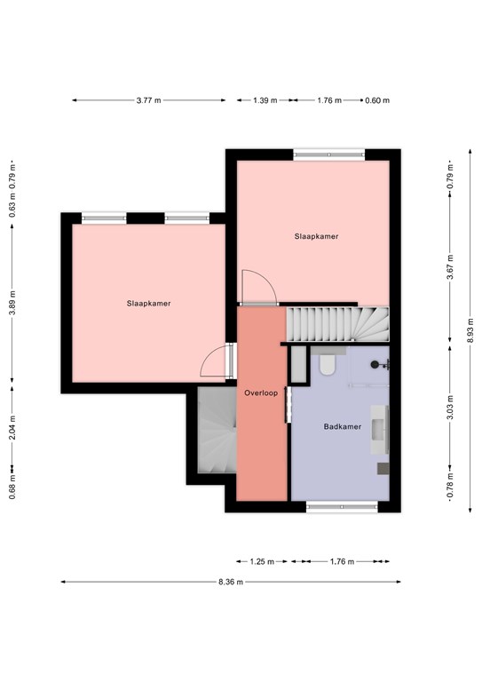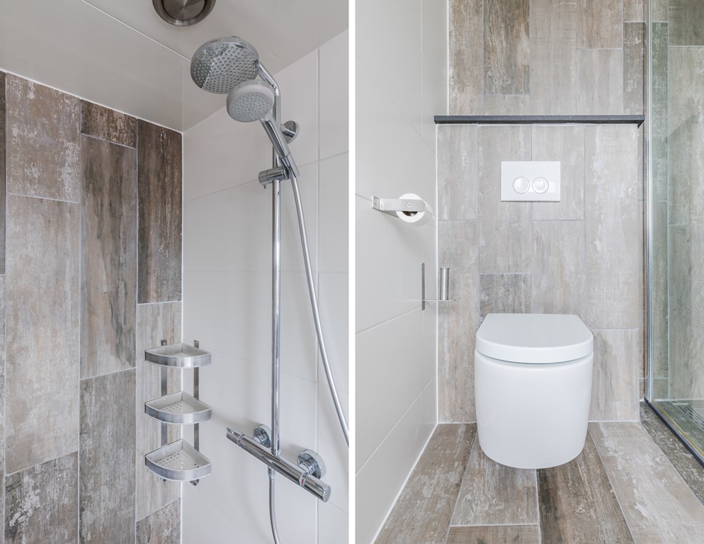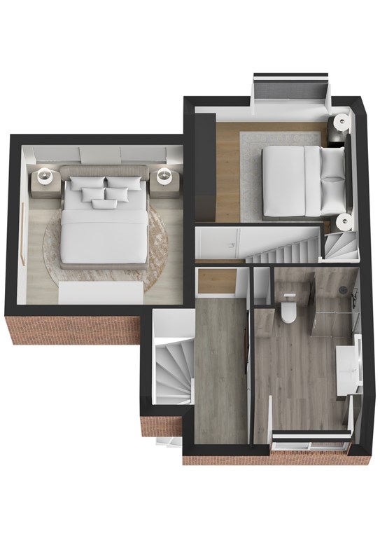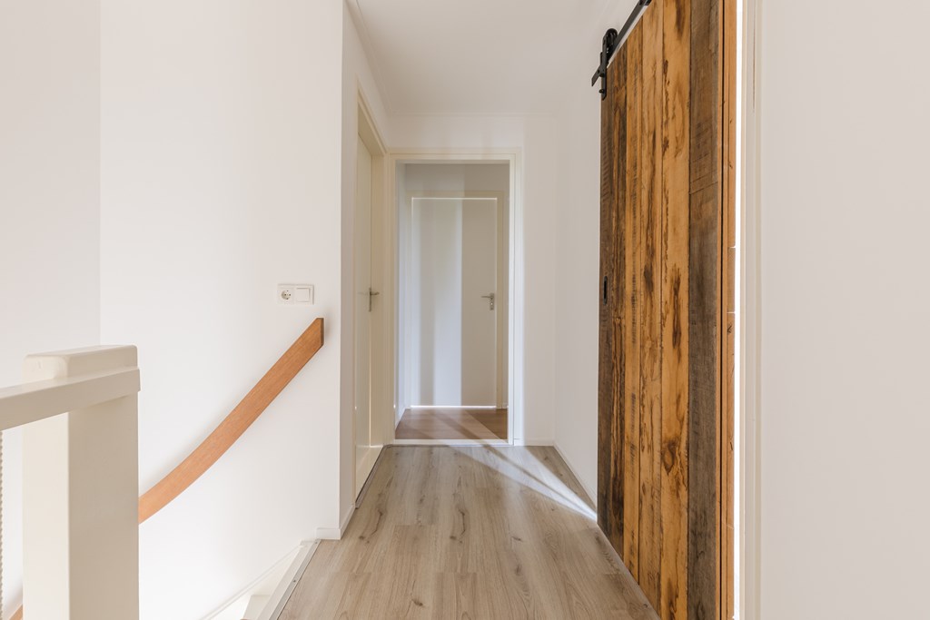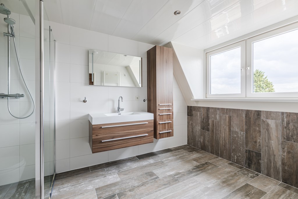 De overloop leidt naar twee ruime slaapkamers (ca. 14 m² en 15 m²), waarvan één met een royale dakkapel. De moderne badkamer (ca. 9 m²) beschikt over een inloopdouche, een wastafel met meubel en een zwevend toilet.