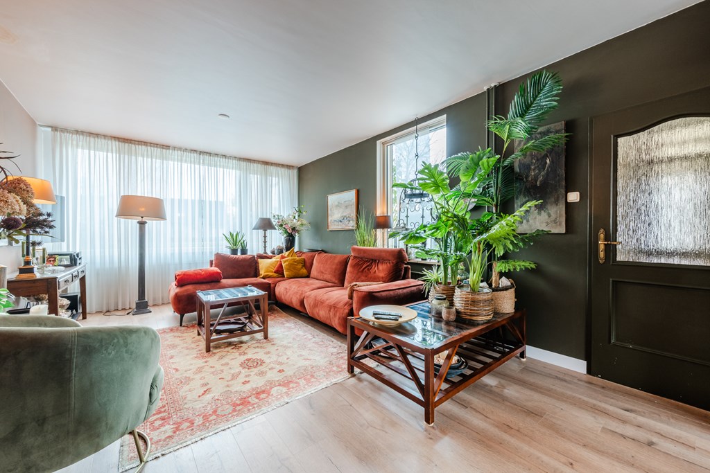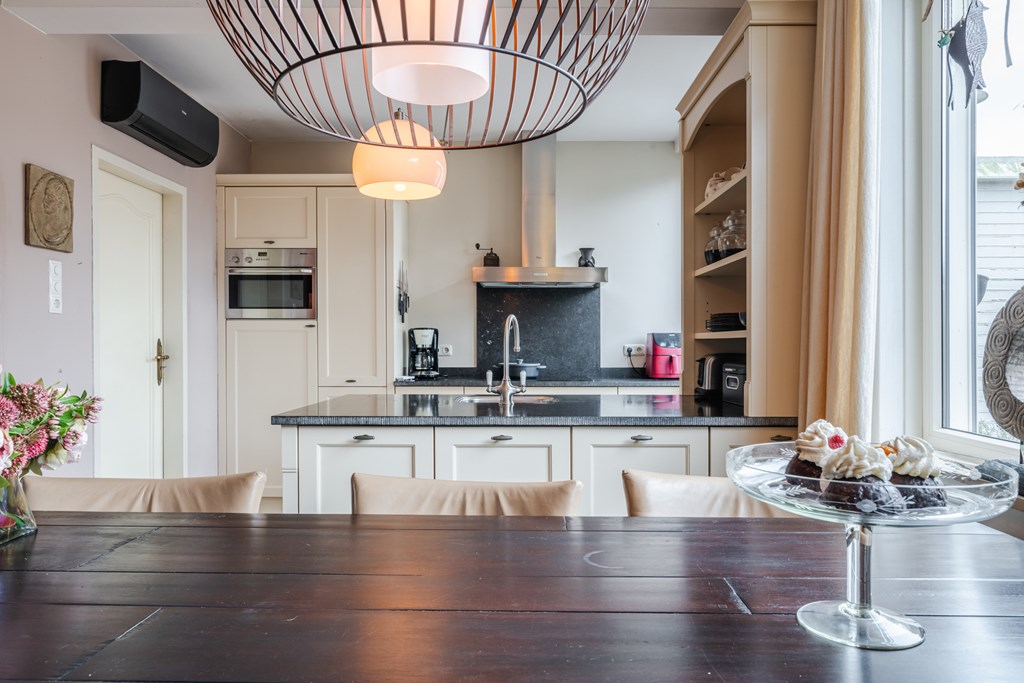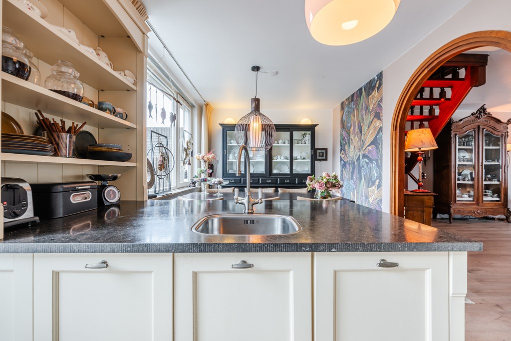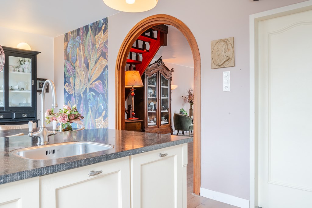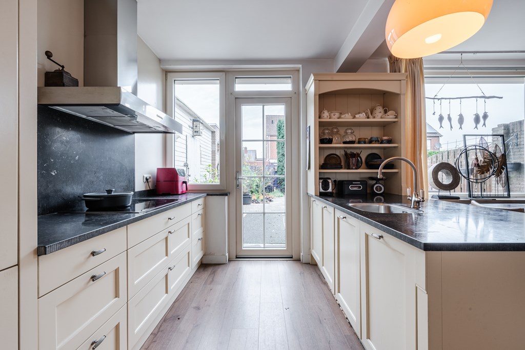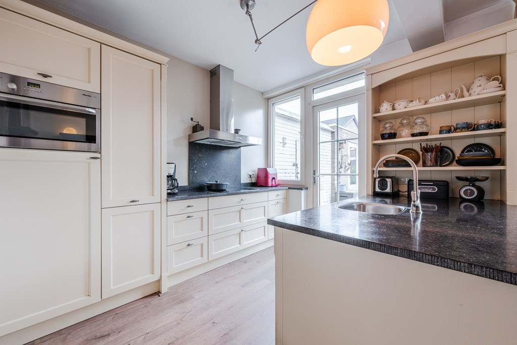 Binnenkomen doe je via de hal (4 m²) met tegelvloer. Het zwevend toilet is netjes afgewerkt en voorzien van een fonteintje. De royale woonkamer (30 m²) is heerlijk licht en voelt dankzij de open doorgang naar de keuken extra ruim aan. De riante woonkeuken (19 m²) is compleet en luxe uitgerust met een inductiekookplaat, afzuigkap, oven, koelkast, vaatwasser, apothekerskast en hardstenen aanrechtblad. Naast de keuken ligt de handige bijkeuken met aansluitingen voor witgoed.