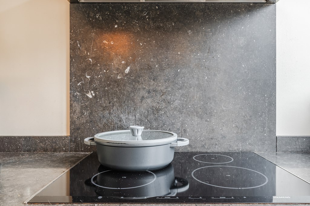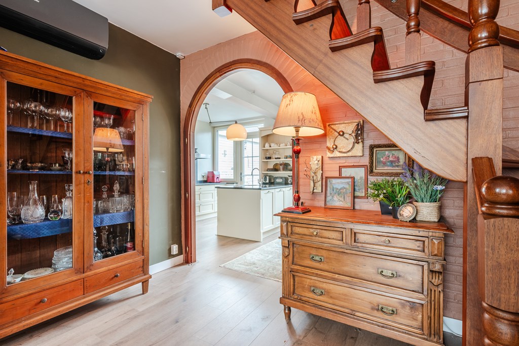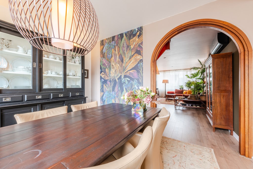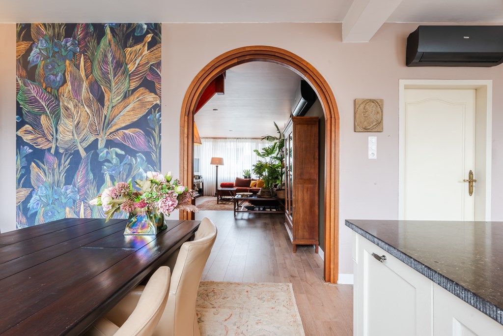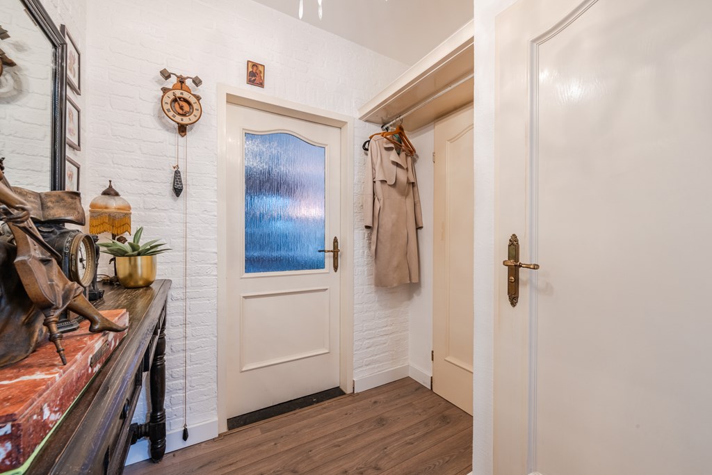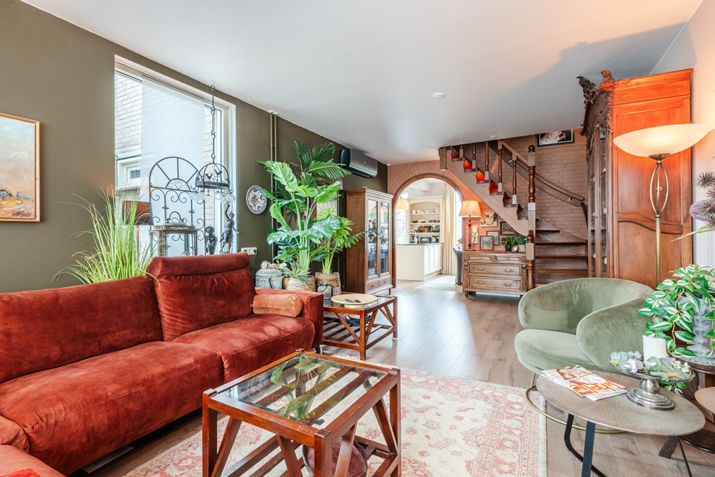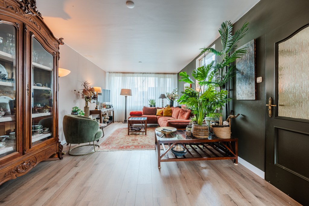 Binnenkomen doe je via de hal (4 m²) met tegelvloer. Het zwevend toilet is netjes afgewerkt en voorzien van een fonteintje. De royale woonkamer (30 m²) is heerlijk licht en voelt dankzij de open doorgang naar de keuken extra ruim aan. De riante woonkeuken (19 m²) is compleet en luxe uitgerust met een inductiekookplaat, afzuigkap, oven, koelkast, vaatwasser, apothekerskast en hardstenen aanrechtblad. Naast de keuken ligt de handige bijkeuken met aansluitingen voor witgoed.