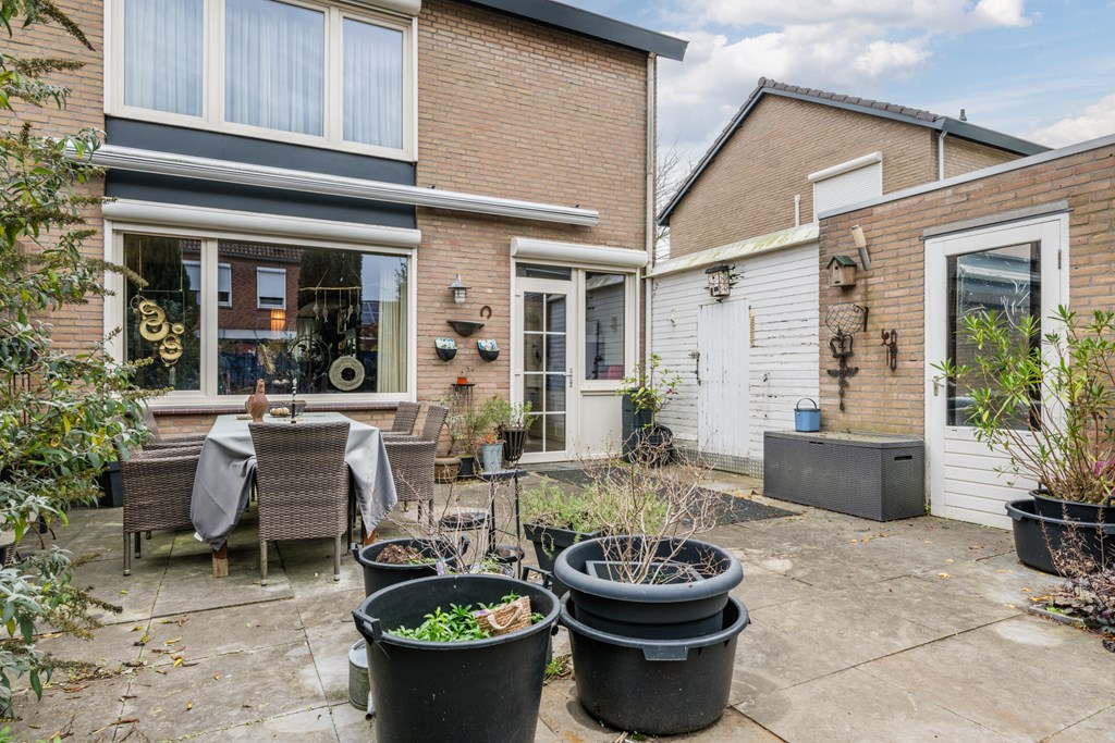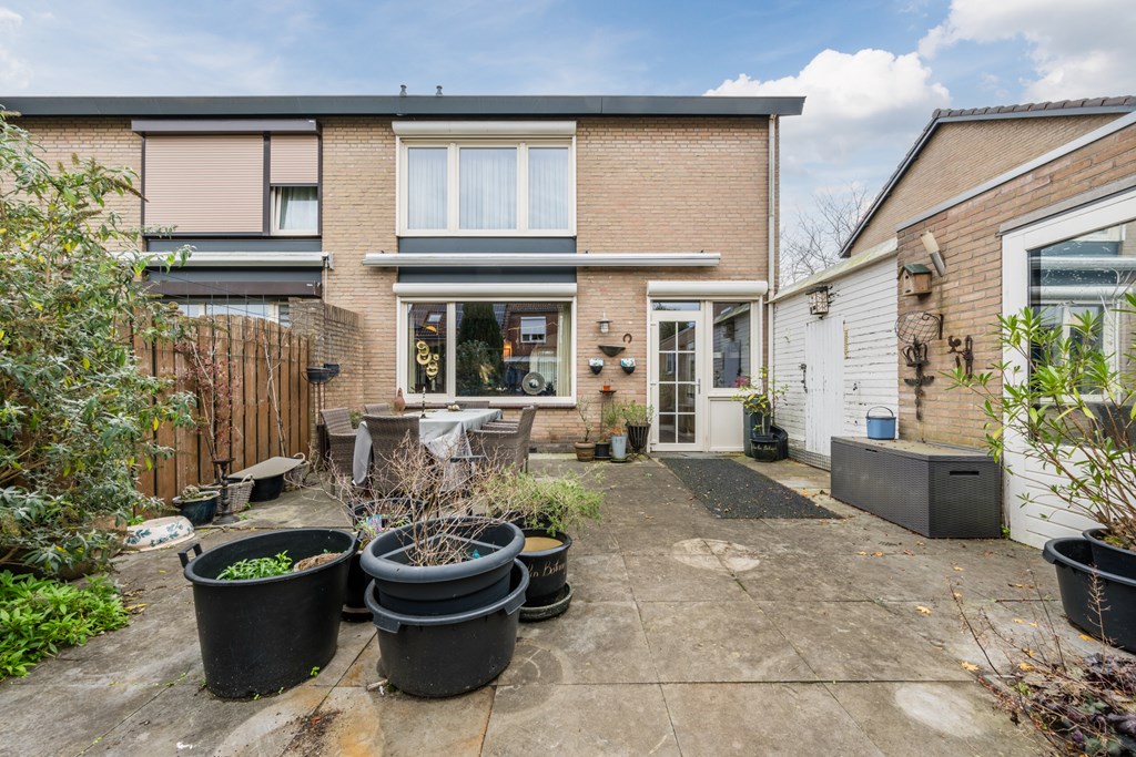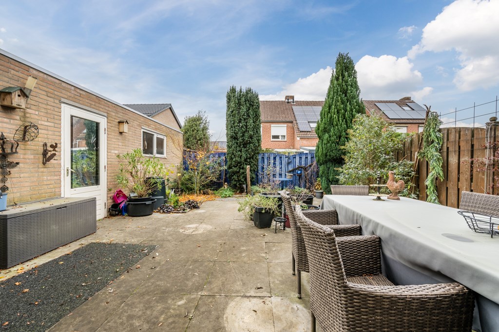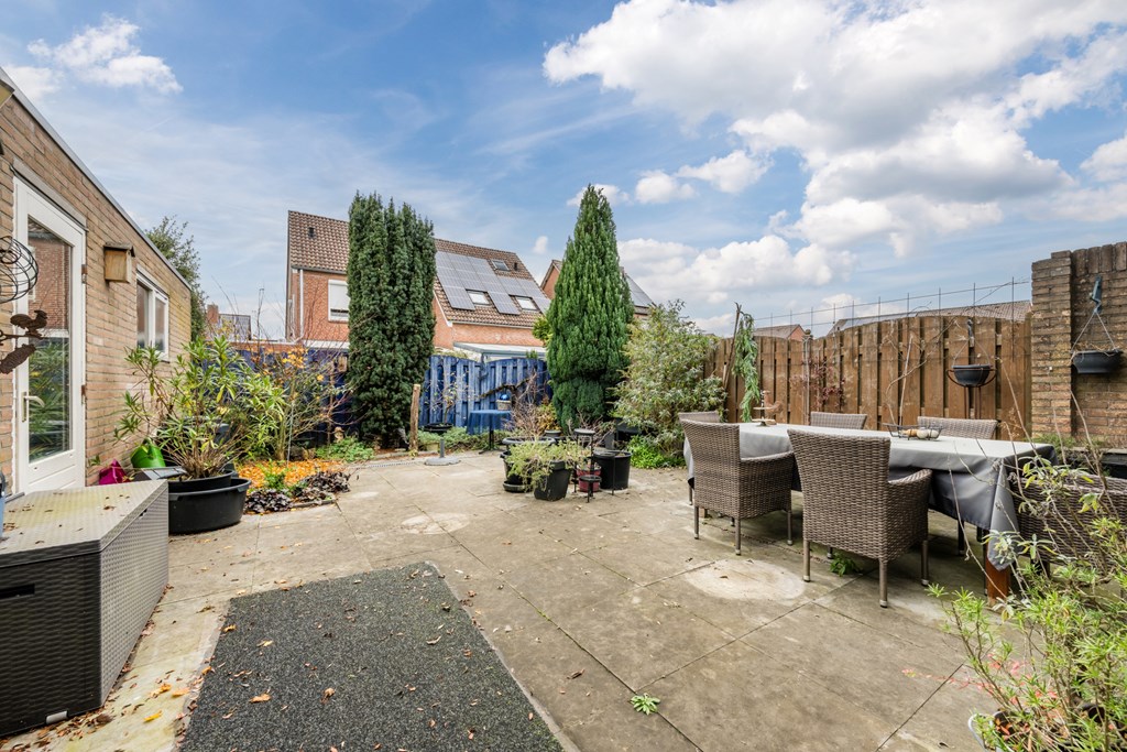 Ligt op het noordwesten, dus voldoende zon, en daarnaast veel privacy. Het terras beschikt over een zonnescherm. Ook is de tuin via de oprit/ carport bereikbaar.