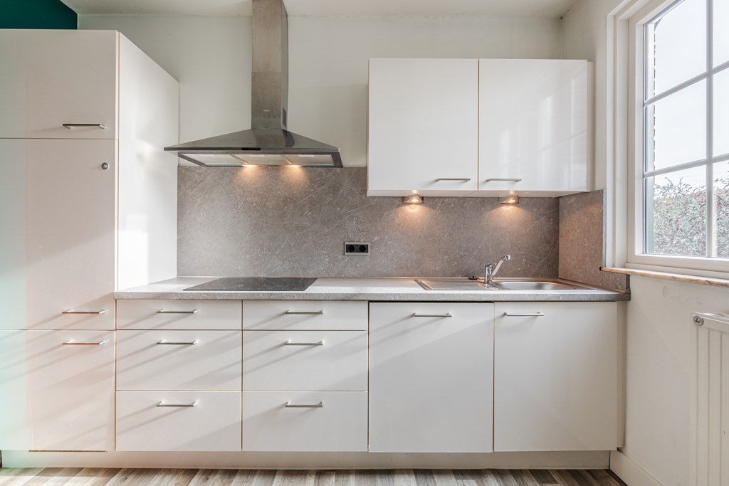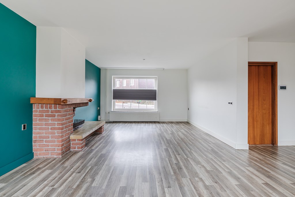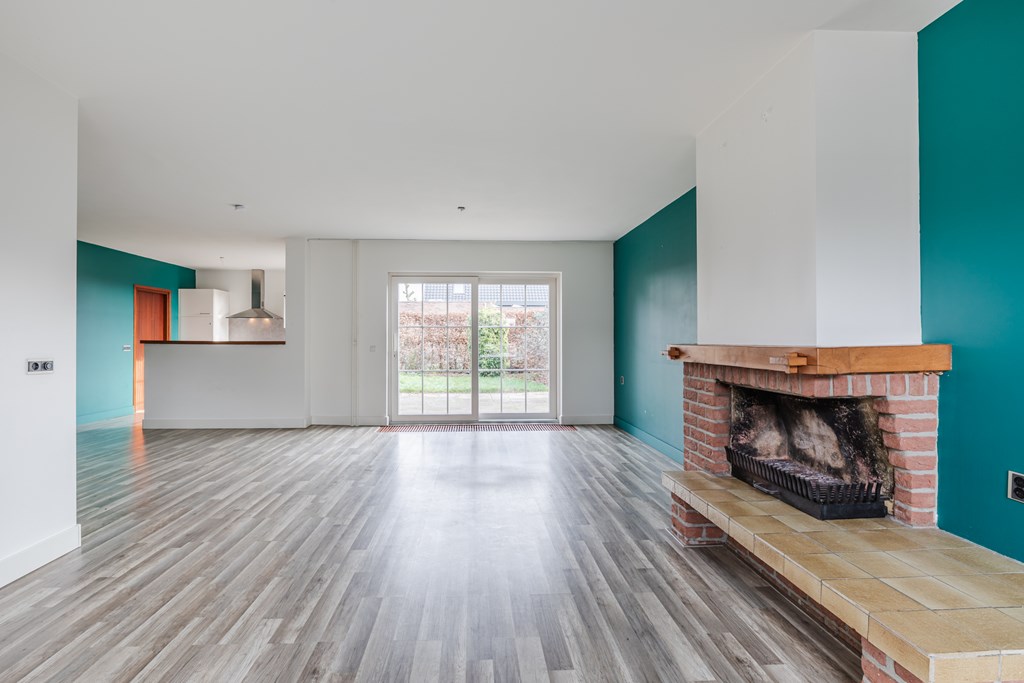 Hal met meterkast en een modern zwevend toilet met fonteintje. De ruime woonkamer (48 m²) met open haard heeft door de grote raampartijen een lichte uitstraling. De moderne, open keuken (9 m²) is voorzien van een kookplaat, afzuigkap, vaatwasser en koelkast. Een ideale plek om te koken en gezellig samen te zijn. Vanuit de woonkamer is er via een schuifpui toegang tot de tuin.