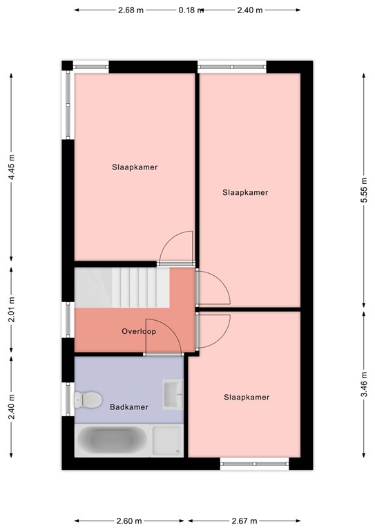 De eerste verdieping beschikt over drie ruime slaapkamers (ca. 13 m², 13 m² en 9 m²), allen met een prettige lichtinval en een praktische indeling.