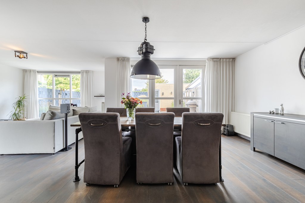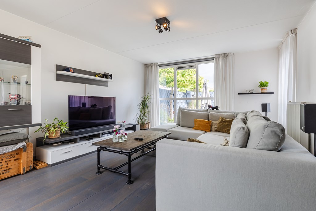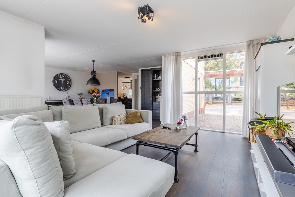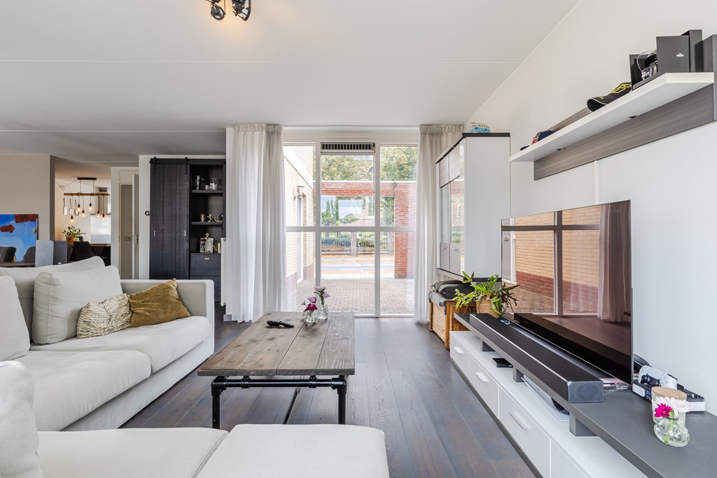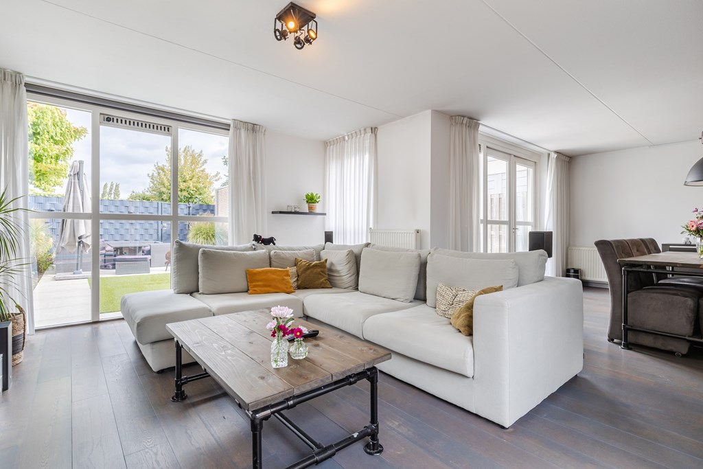 De royale living (ca. 47 m²) in een speelse Z-vorm valt direct op door de grote ramen en de warme parketvloer. Dankzij de openslaande deuren naar de tuin is er volop licht en voelt de ruimte extra ruimtelijk aan.