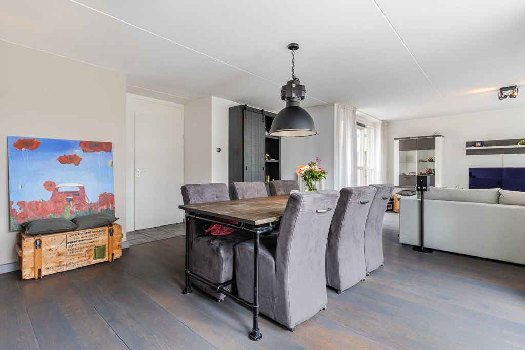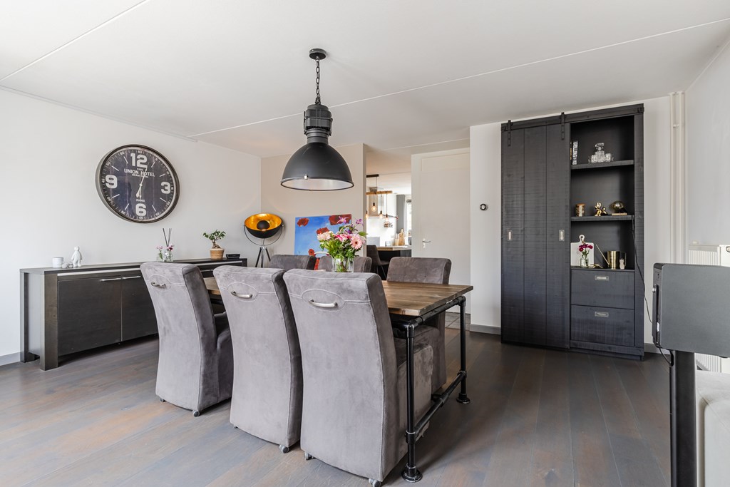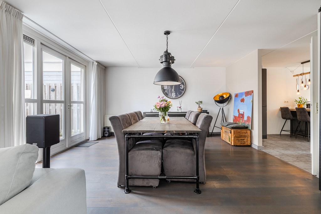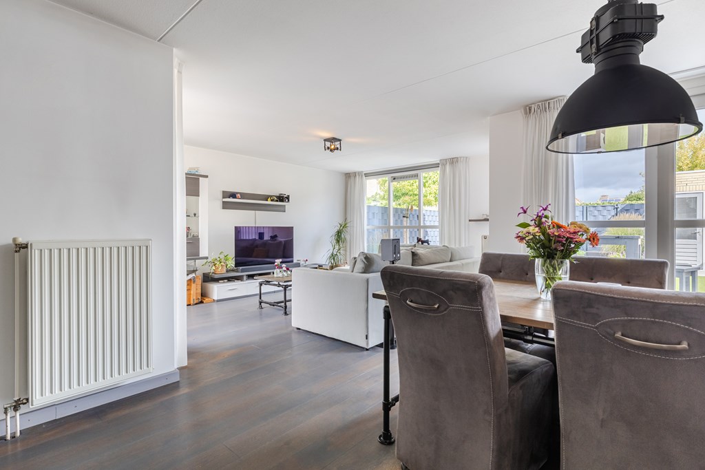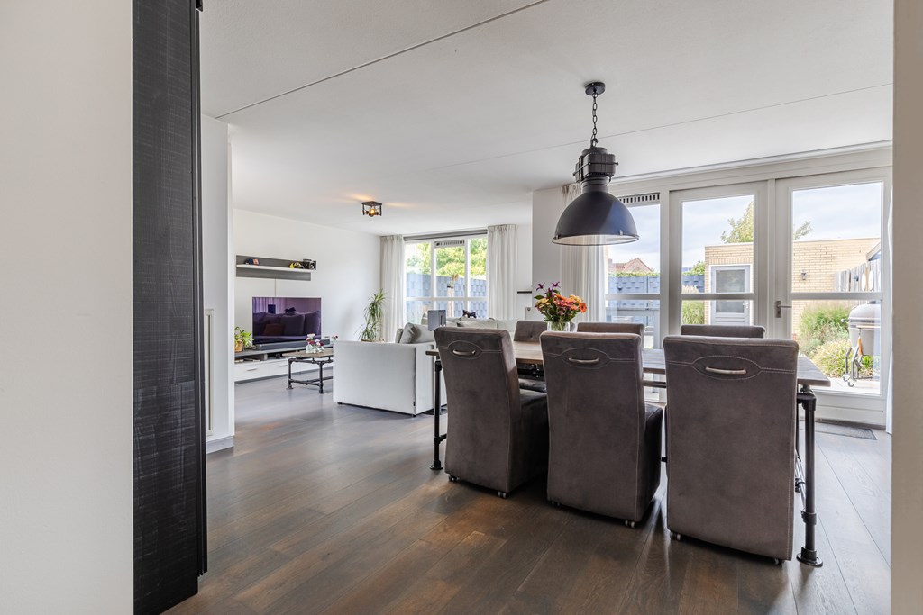 De royale living (ca. 47 m²) in een speelse Z-vorm valt direct op door de grote ramen en de warme parketvloer. Dankzij de openslaande deuren naar de tuin is er volop licht en voelt de ruimte extra ruimtelijk aan.