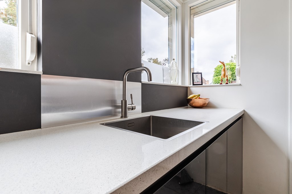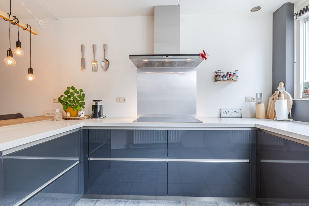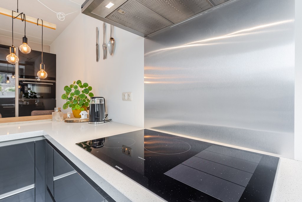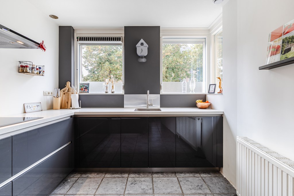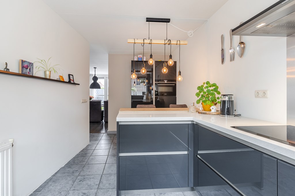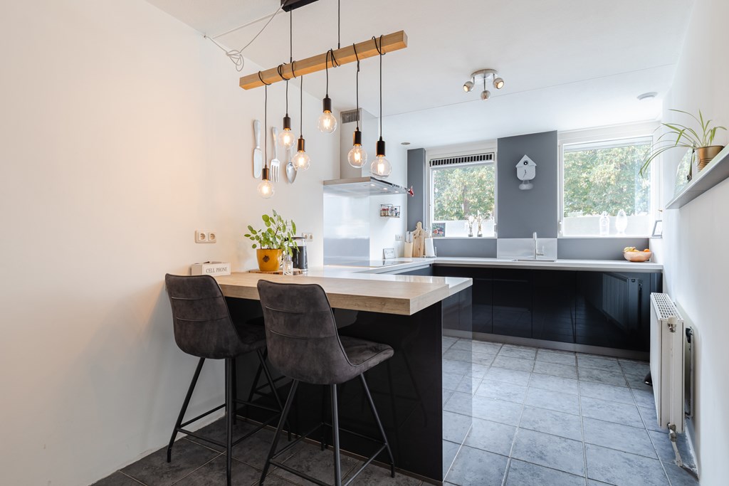 De leefkeuken (ca. 13 m²) is uitgevoerd in een moderne opstelling en voorzien van een inductiekookplaat, afzuigkap, combimagnetron, koelkast en vaatwasser. De sfeervolle bar maakt deze keuken een echte ontmoetingsplek, ideaal voor een snel ontbijt of een borrel met vrienden.