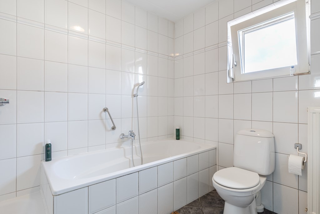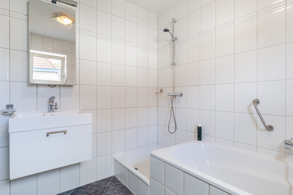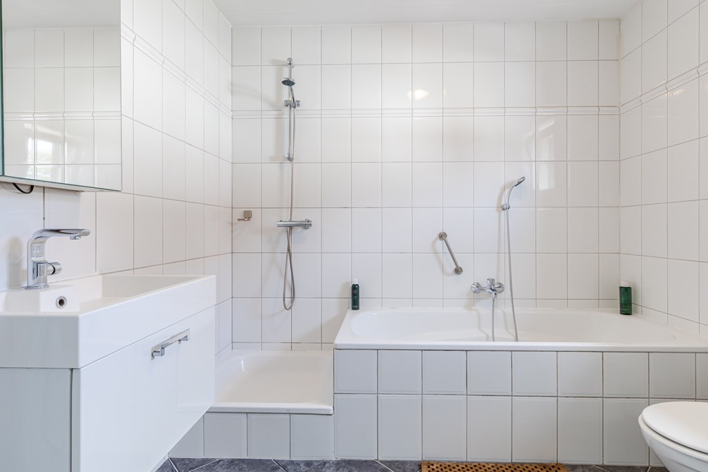 De badkamer (ca. 6 m²) is compleet uitgerust met een ligbad, douche, wastafel en toilet.