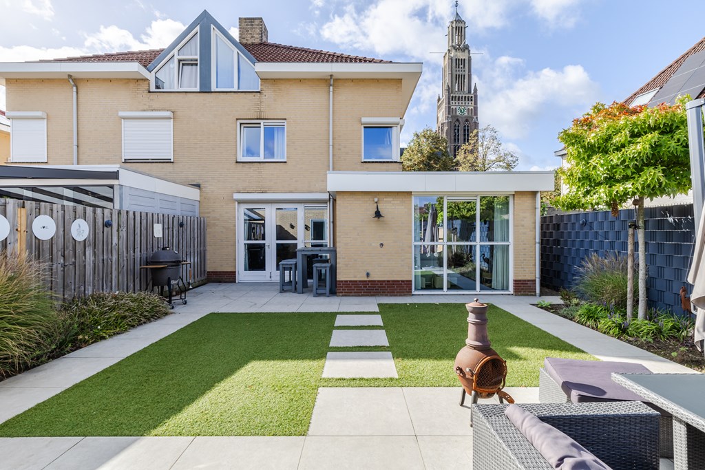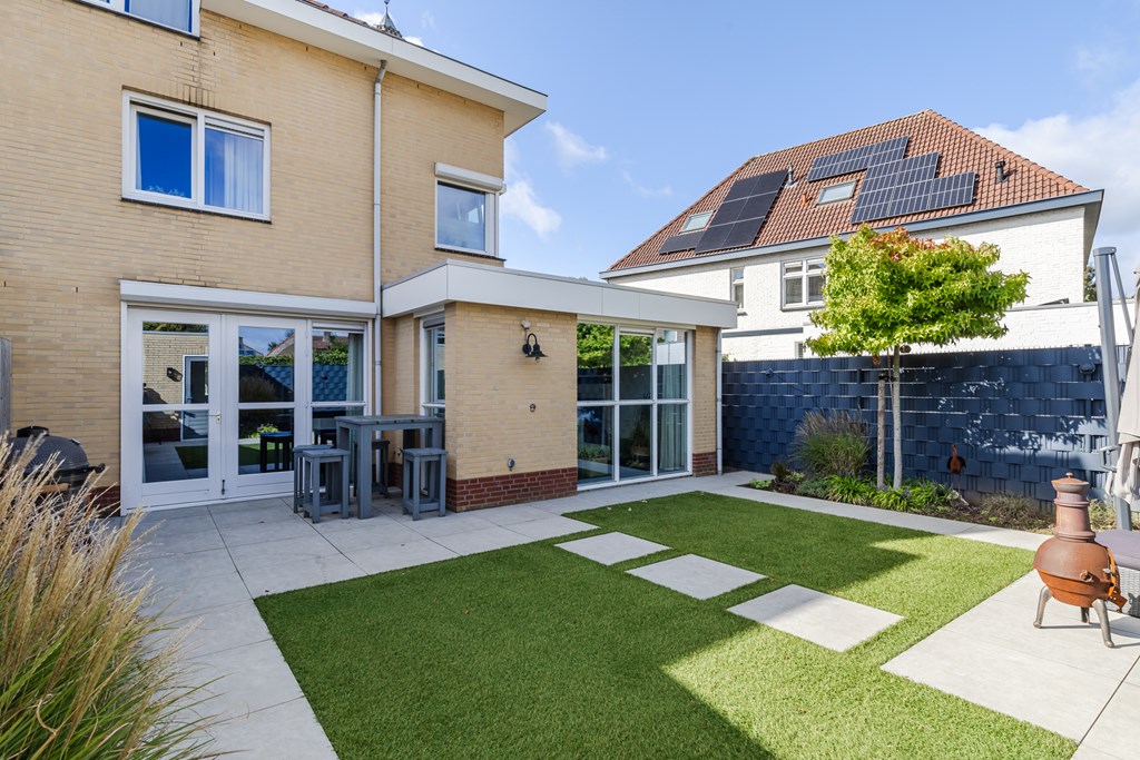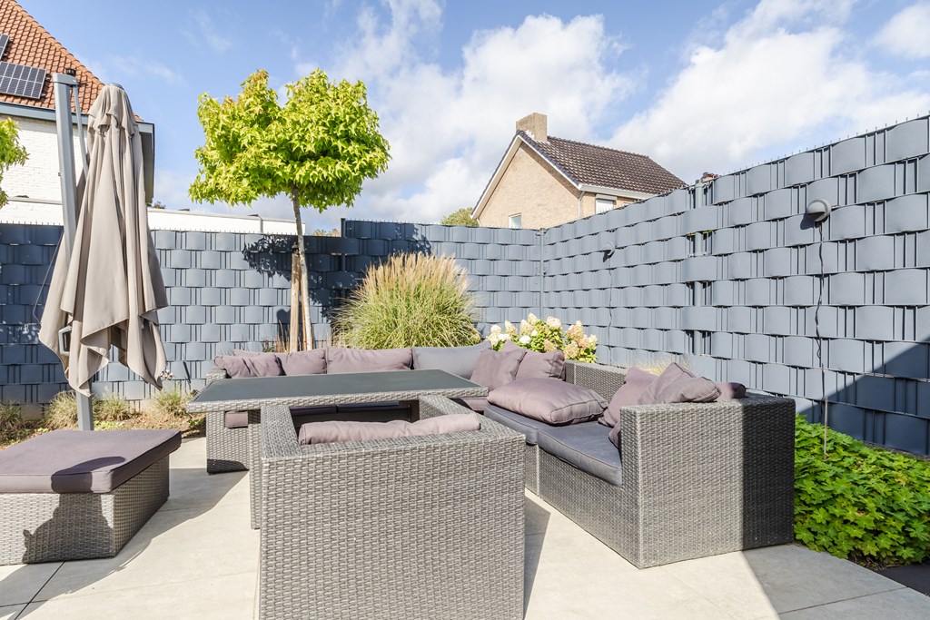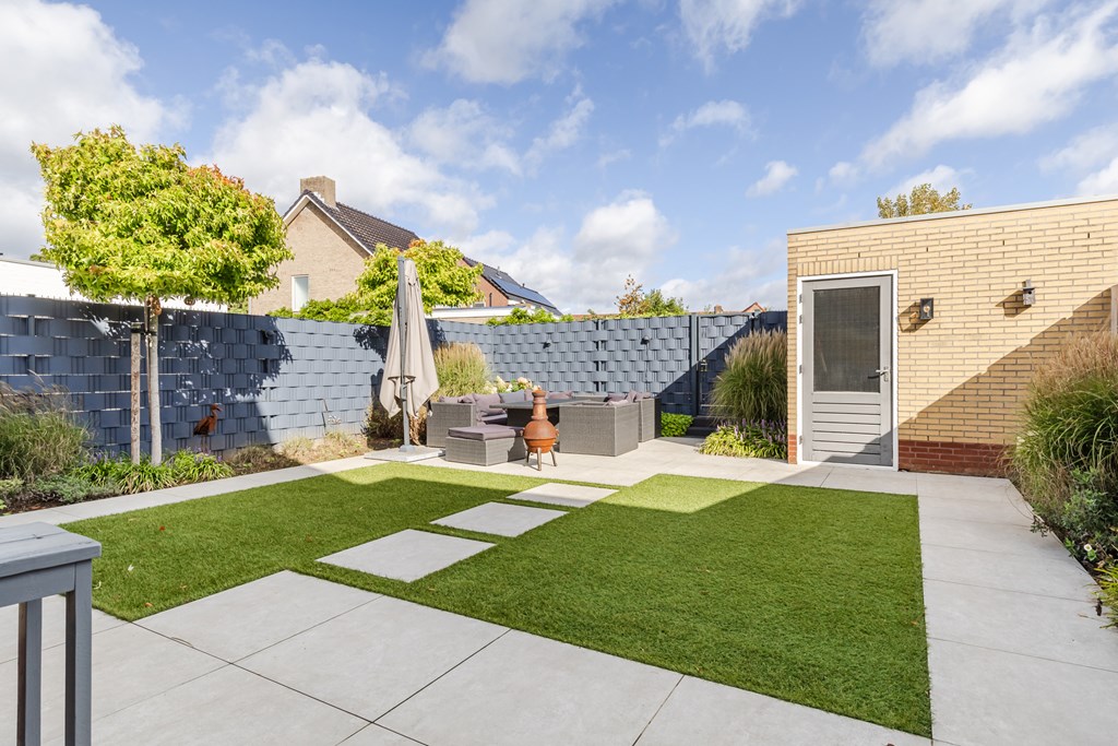 De achtertuin is onder architectuur aangelegd en combineert strakke bestrating met groene accenten. Hier geniet je in alle rust en privacy van het buitenleven, terwijl de tuin toch onderhoudsvriendelijk blijft. Achter in de tuin bevindt zich een praktische berging/hobbyruimte.