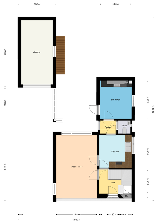 Hal (6 m²) met leisteenvloer, zonnige woonkamer (23 m²) met een laminaatvloer, ruime woonkeuken (10 m²) met een keukenopstelling v.v. een keramische kookplaat, afzuigkap, oven en koelkast, portaal, toilet met fonteintje, bijkeuken/berging (9 m²) met opstelling voor de wasmachine, vaatwasser en c.v.- installatie. Garage (17 m²) met een berging/werkplaats (17 m²).