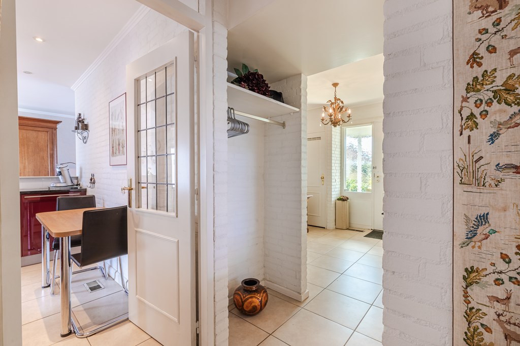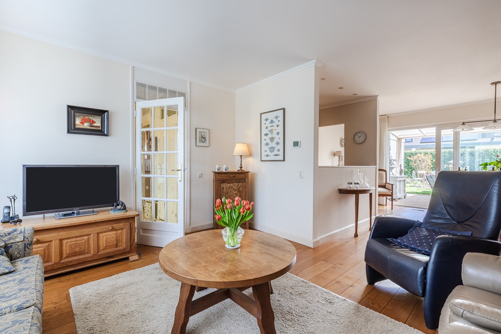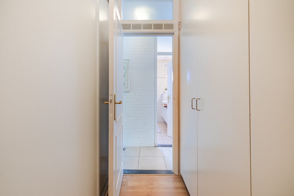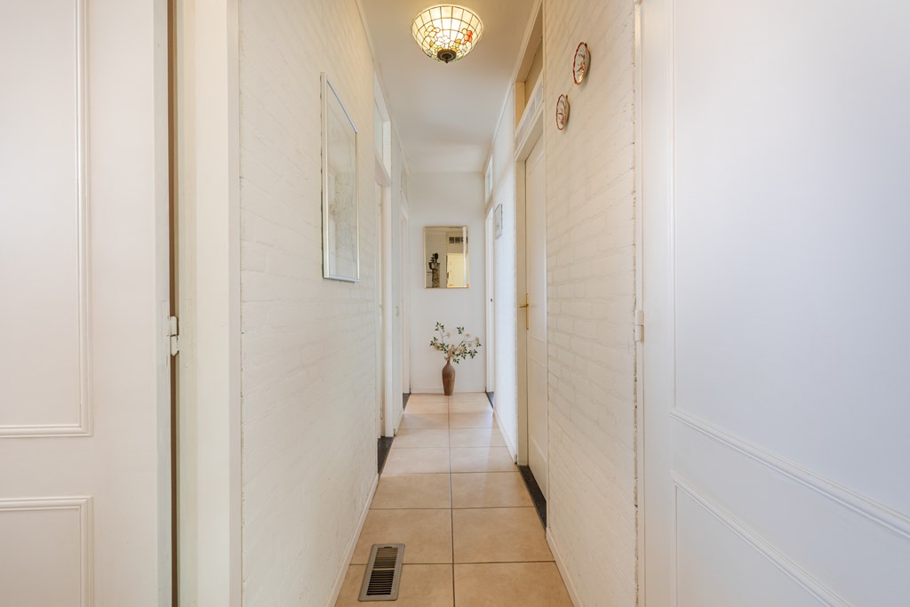 Hal (10 m²) met tegelvloer, toilet met fonteintje, gang, royale en lichte woonkamer (31 m²) met een eiken parketvloer en toegang middels een
