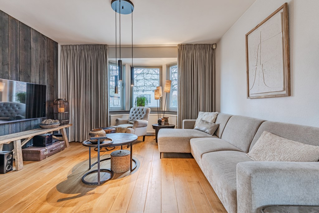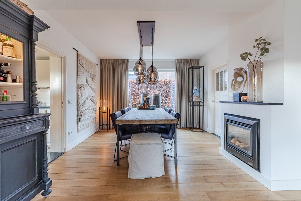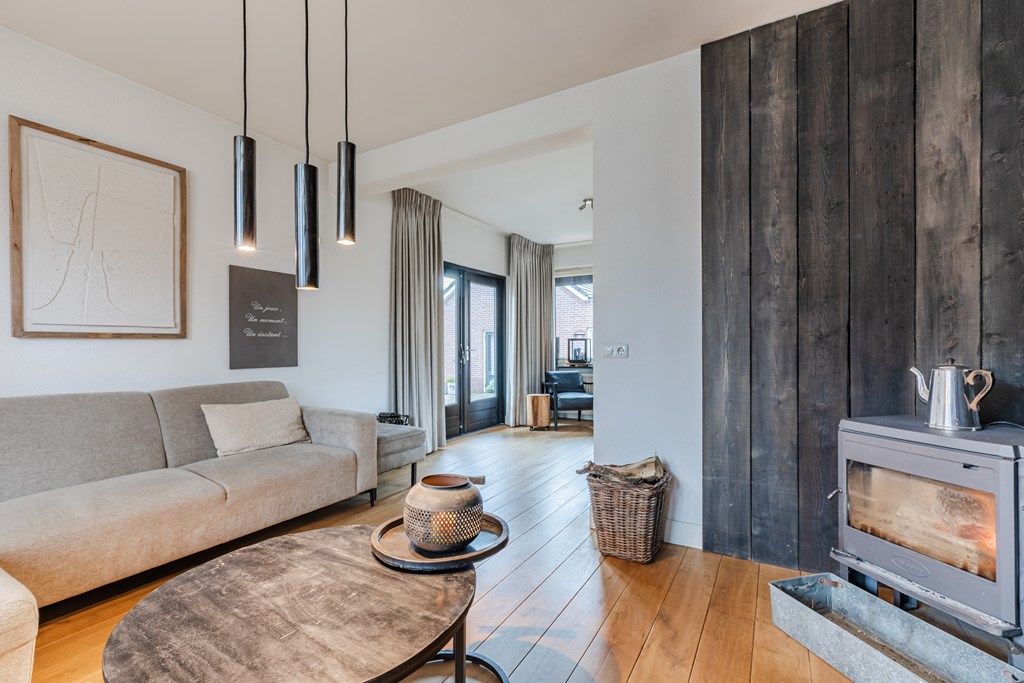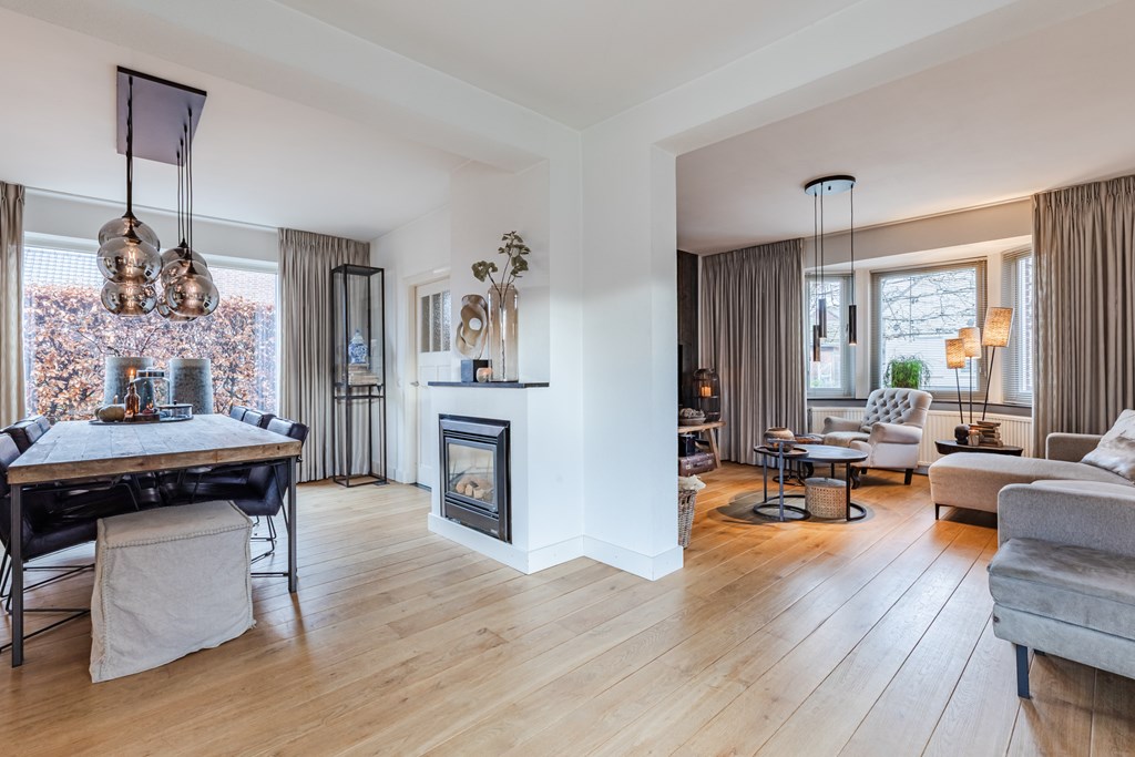 Je komt binnen in een prettige ontvangsthal (8 m²) die direct de sfeer van het huis weergeeft. De royale L-vormige woonkamer (40 m²) met erker, eiken plankenvloer, inbouwhaard én houtkachel is een heerlijke plek om thuis te komen. De gesloten keuken (11 m²) is praktisch ingericht en voorzien van alle benodigde apparatuur: een keramische kookplaat, afzuigkap, combi magnetron, koelkast en vaatwasser.