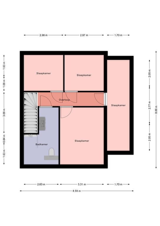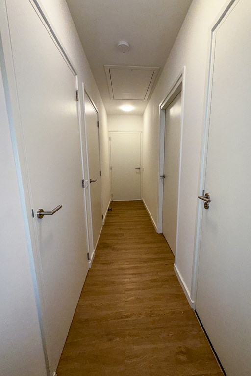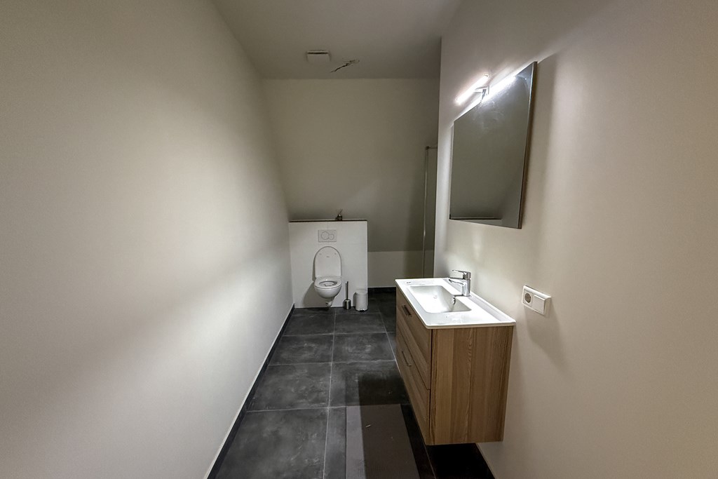 Overloop (5 m²) met toegang tot vier slaapkamers (5 m², 6 m², 9 m² en 12 m²) en een moderne badkamer (8 m²) met inloopdouche, wastafel met meubel en zwevend toilet. Afwerking met doorlopende laminaatvloer.