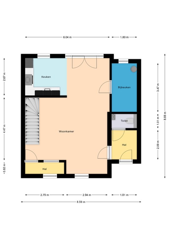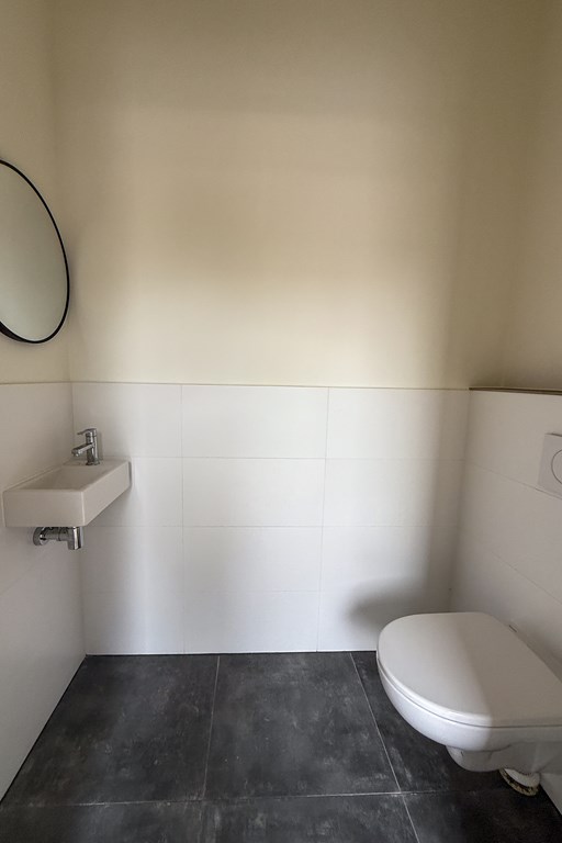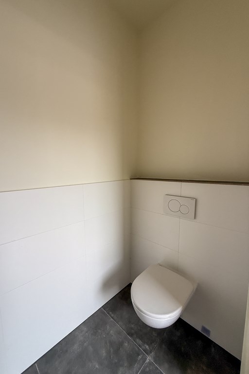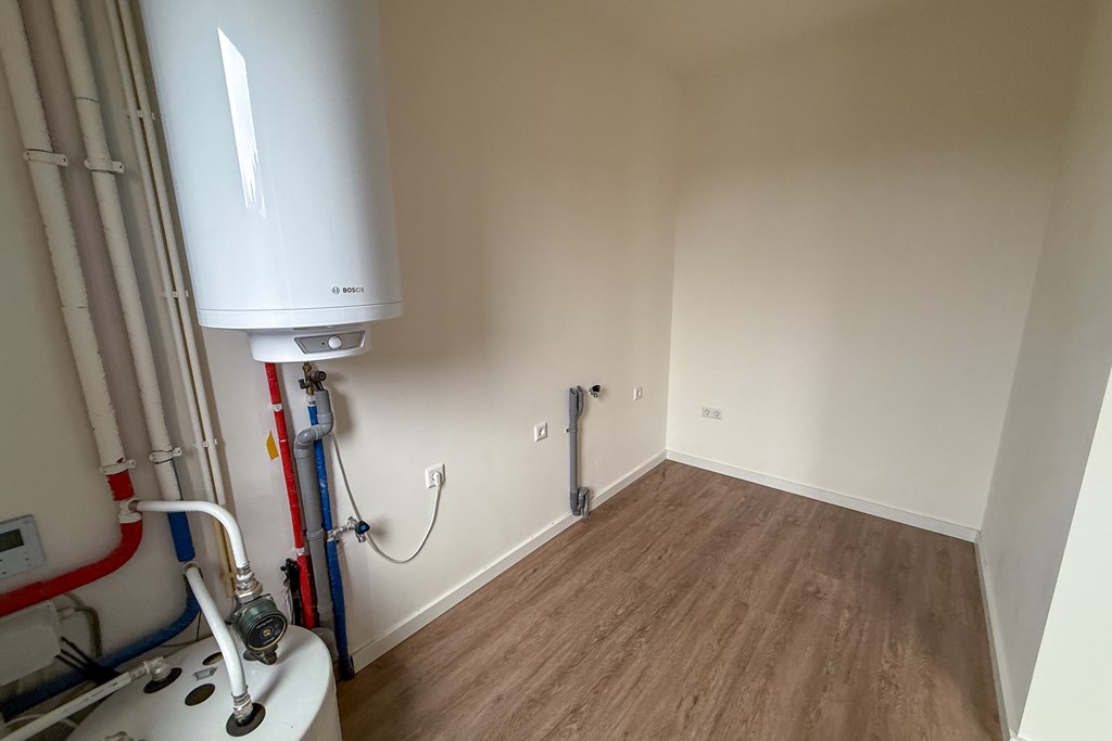 Entree met hal (4 m²) en toegang tot het moderne zwevende toilet (2 m²). De ruime woonkamer (29 m²) is voorzien van een laminaatvloer en heeft een open trap. De moderne keuken (16 m²) beschikt over een inductiekookplaat met afzuigkap, vaatwasser, combimagnetron en koelkast. Vanuit de keuken is het terras bereikbaar. Aangrenzend ligt de bijkeuken (6 m²) met wasmachineaansluiting en de technische installatie.