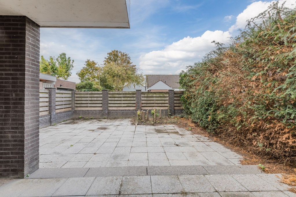 De op het zuiden gelegen achtertuin (80 m²) heeft een overdekt terras en een onderhoudsvriendelijke tuin die ook via een achterom te bereiken is.