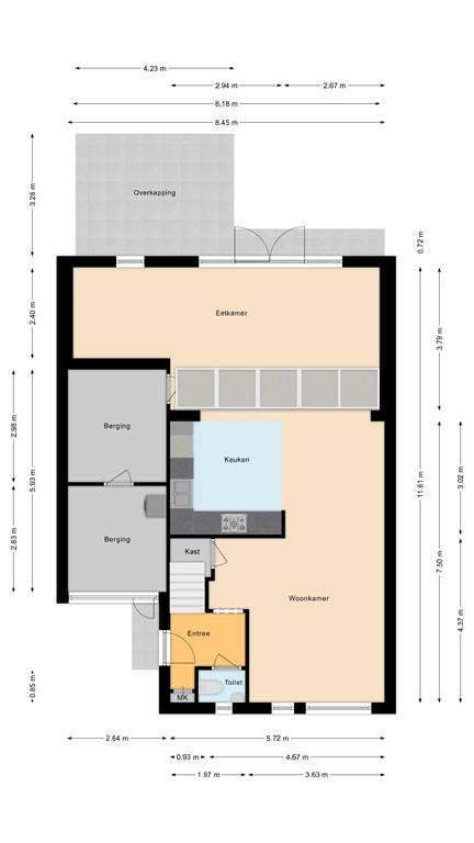 Entree (3 m²), woonkamer (16 m²), open keuken (17 m²) met moderne keukenopstelling v.v. vaatwasser, gaskookplaat, afzuigkap, koelkast en combimagnetron. De lichtstraat en een grote schuifpui zorgen voor een prachtige lichtinval in de keuken en de eetkamer/serre die maar liefst 31 m² groot is.