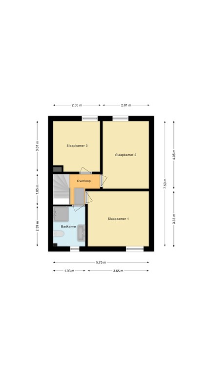 Op de 1e verdieping bevinden zich de overloop (3 m²), 3 slaapkamers (12 m², 11 m² en 9 m²) en de badkamer (5 m²) met douche, dubbele wastafel in inbouwmeubel en een zwevend toilet.