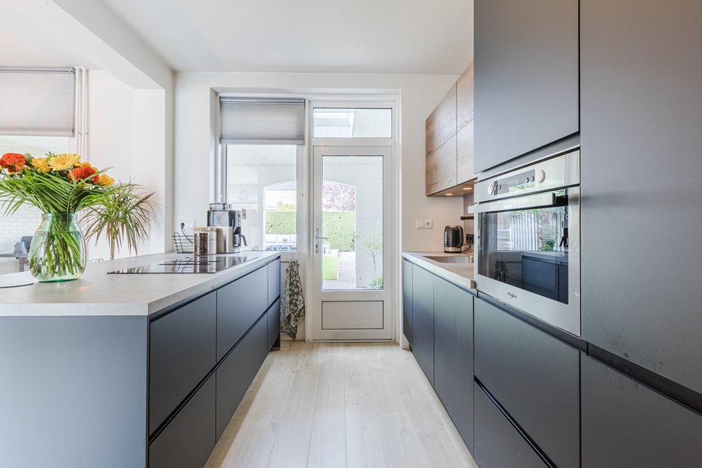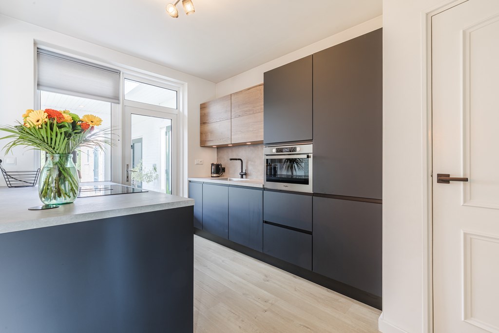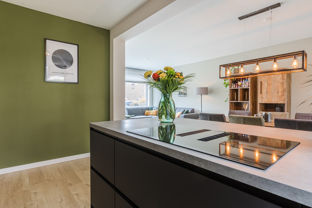De moderne keuken (10 m²) is uitgerust met een kookeiland, inductiekookplaat met geïntegreerde afzuiging, combimagnetron, koelkast en vaatwasser, perfect voor wie van koken en gezelligheid houdt.
