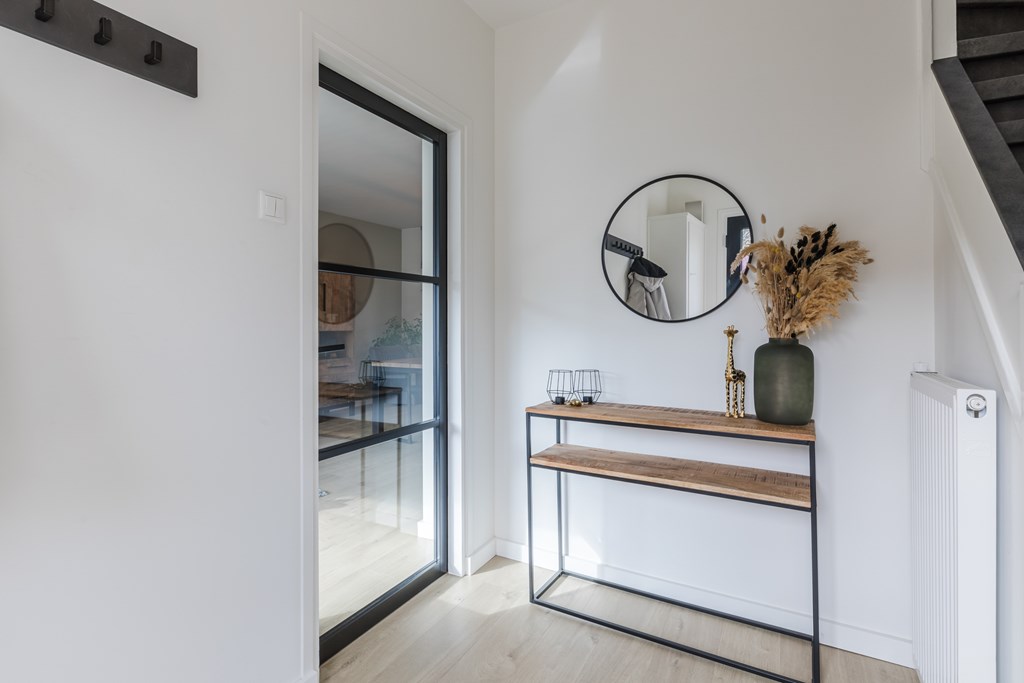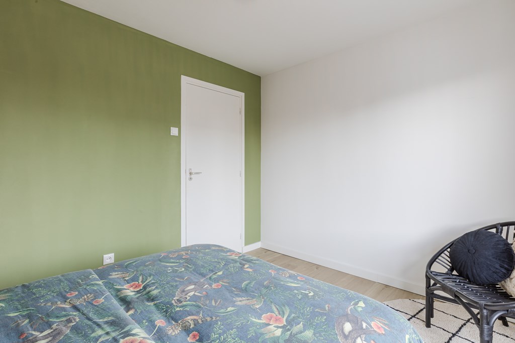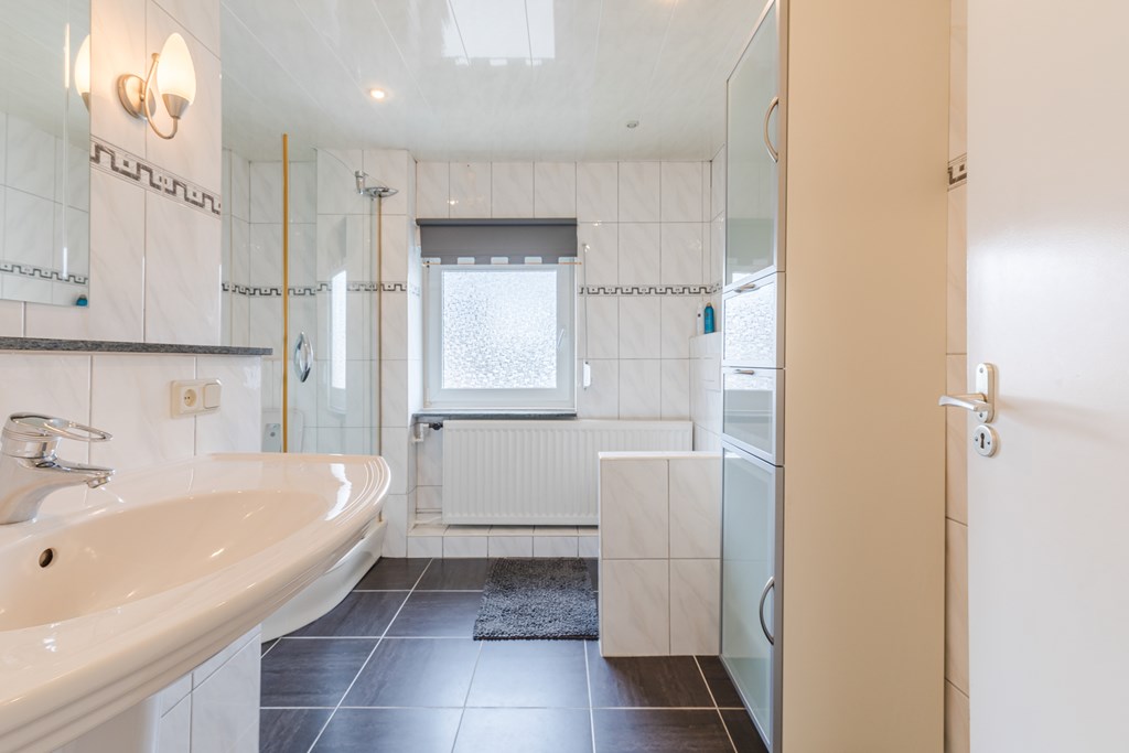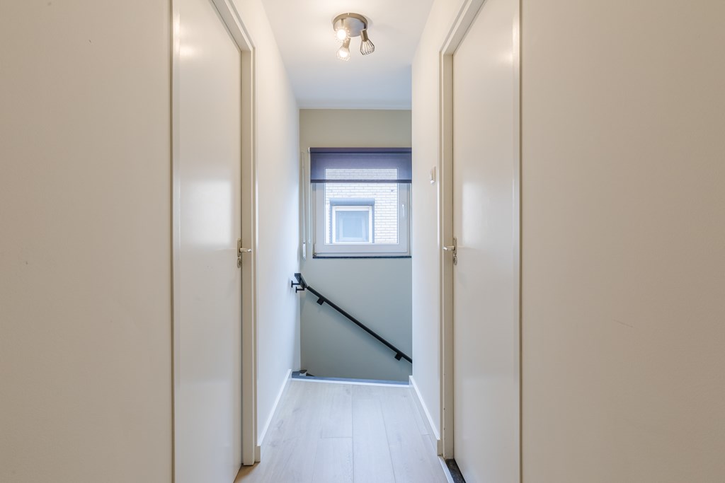 De moderne badkamer (7 m²) is ruim opgezet en uitgerust met een douche, zwevend toilet en wastafel. Via een kast op de overloop is er toegang tot de tweede verdieping via een semi-vaste trap.