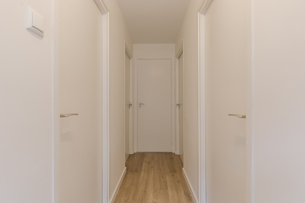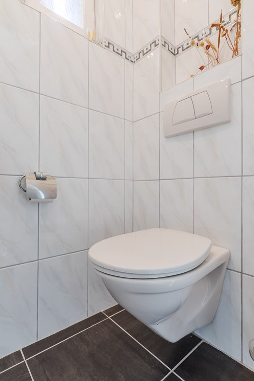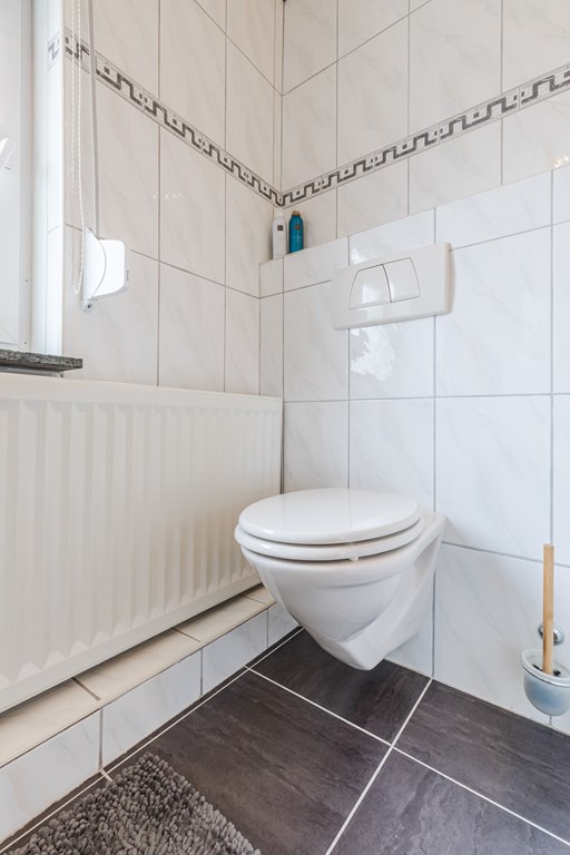 De begane grond is voorzien van een lichte laminaatvloer en beschikt over een moderne, open indeling. Vanuit de hal (5 m²) zijn het zwevend toilet met fonteintje en de woonkamer bereikbaar.