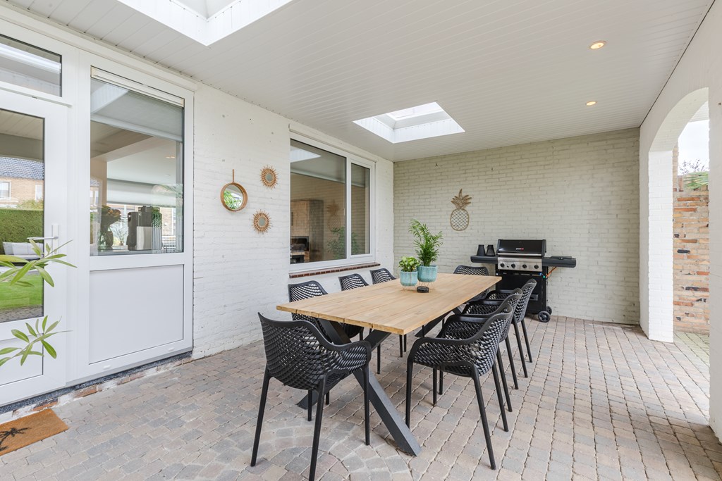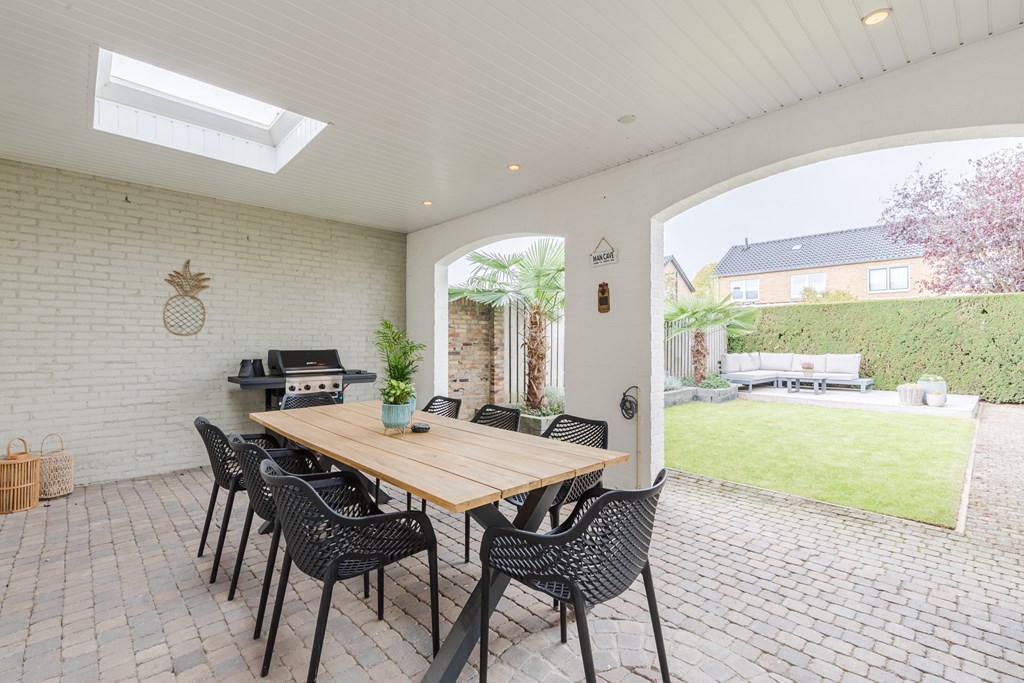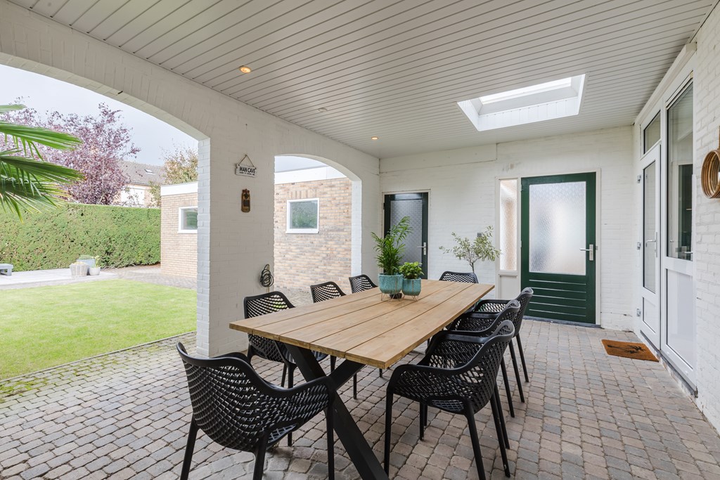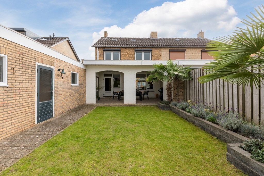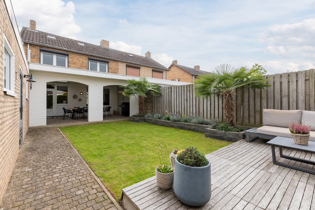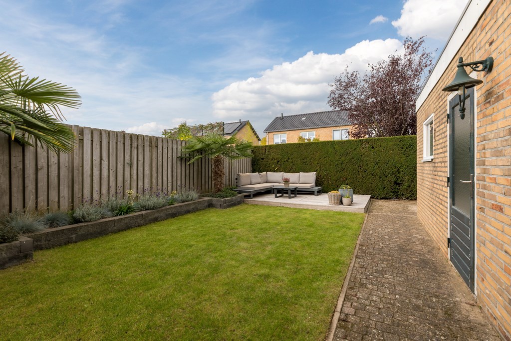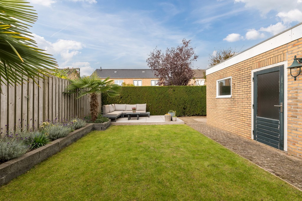 De verzorgde achtertuin (83 m²) ligt gunstig op het westen en biedt daardoor veel zonuren. De tuin is bereikbaar vanuit de keuken én via een praktische zijingang. Er is een degelijke, gemetselde overkapping (24 m²) en achterin de tuin bevindt zich een fraaie loungevlonder, ideaal om zomers te ontspannen.