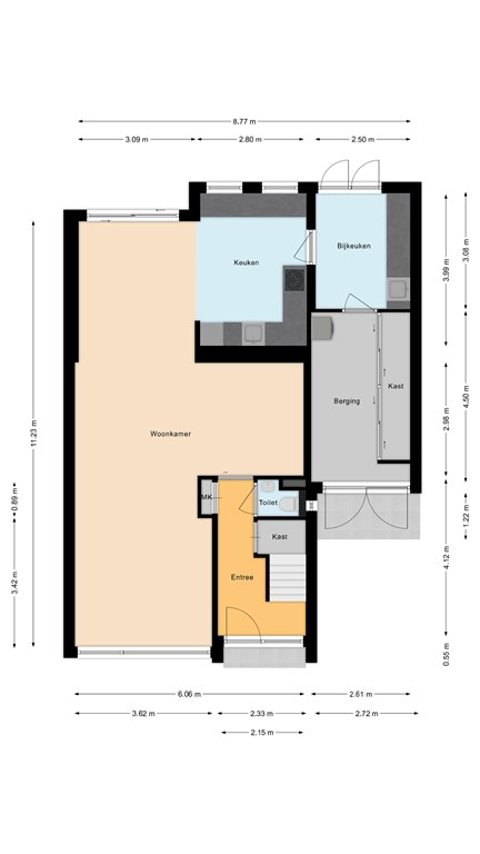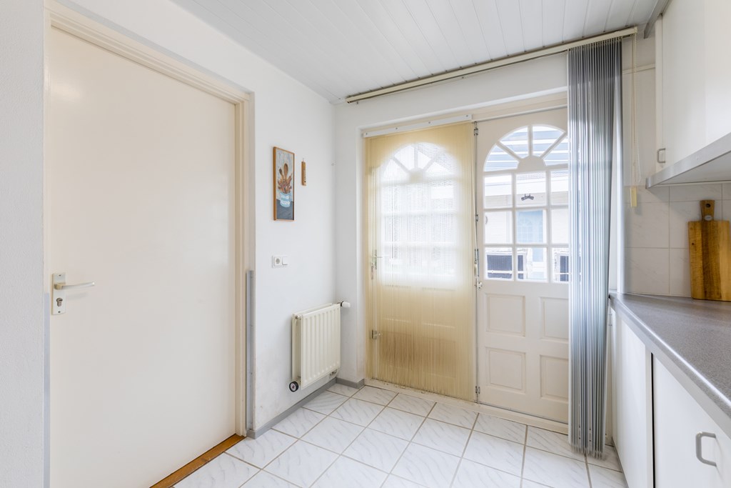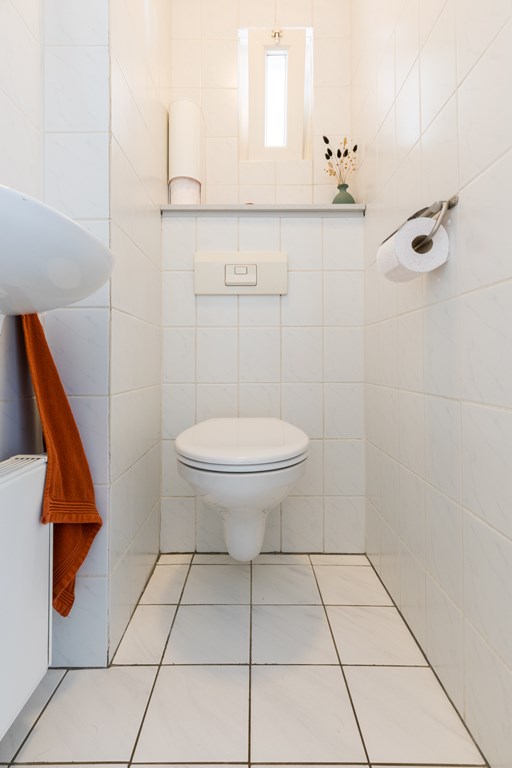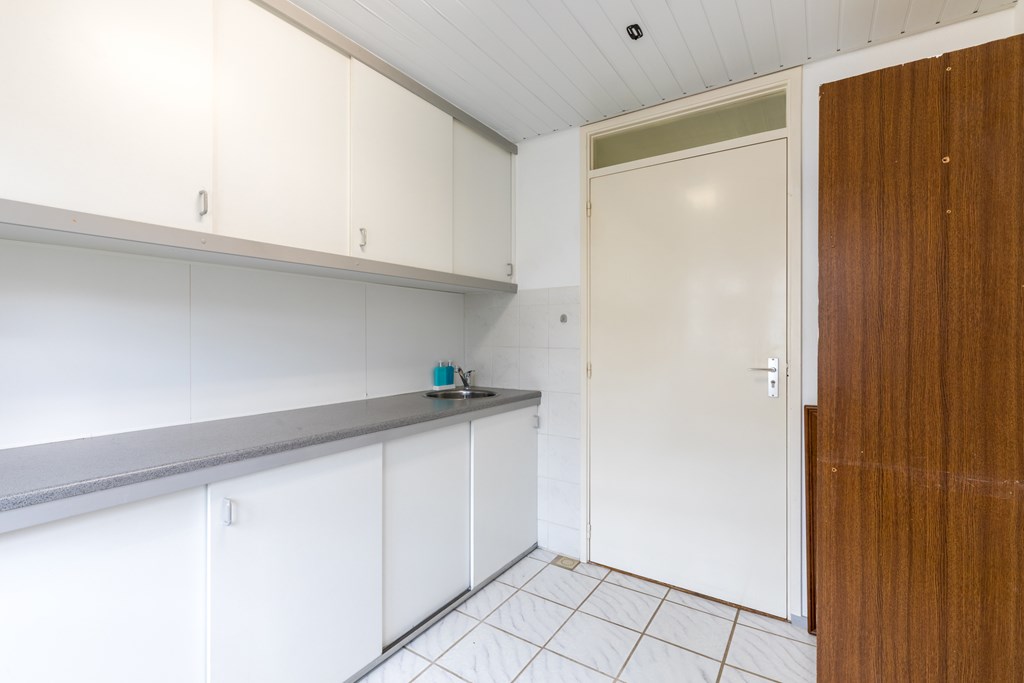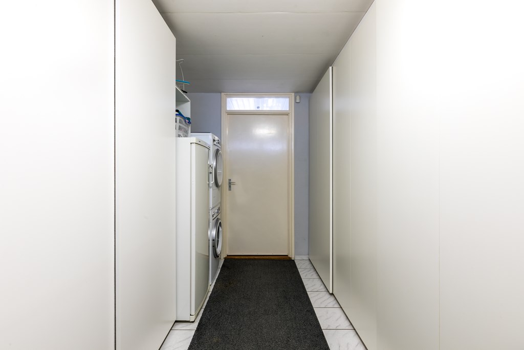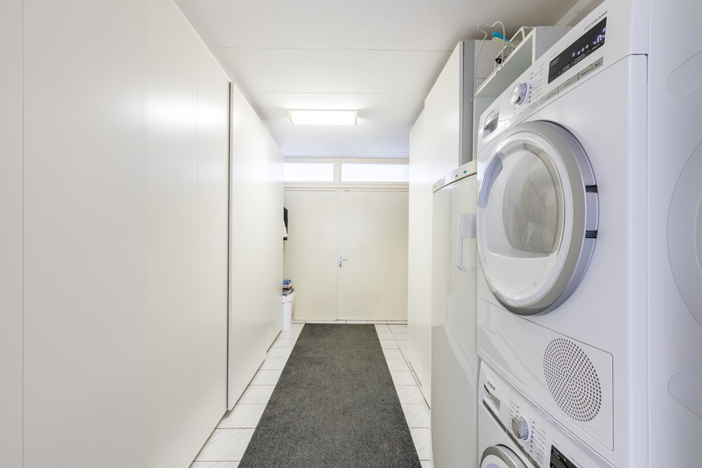 Hal (4 m²) met garderobekast en zwevend toilet en fonteintje. De T-vormige woonkamer (46 m²) biedt veel licht en ruimtelijkheid ook door de lichte, diagonaal gelegde laminaatvloer. De nieuwe, halfopen keuken (11 m²) is geplaatst in 2025 en uitgerust met een inductiekookplaat, afzuigkap, koelkast, combimagnetron en vaatwasser. Aansluitend ligt de bijkeuken (8 m²) met witgoedaansluiting en extra bergruimte is nog te vinden in de voorgelegen berging (11 m²).