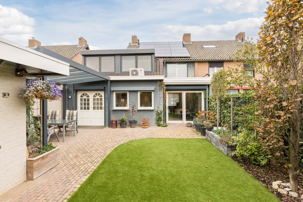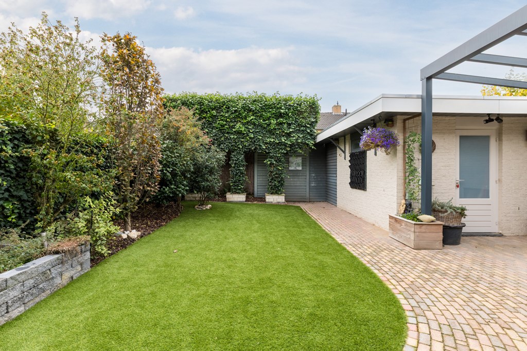 De besloten achtertuin (ca. 105 m²) is onderhoudsvriendelijk aangelegd en biedt een terras, een tuinberging en een praktische overkapping waar ook met mindere weersomstandigheden genoten kan worden van het buiten zijn.