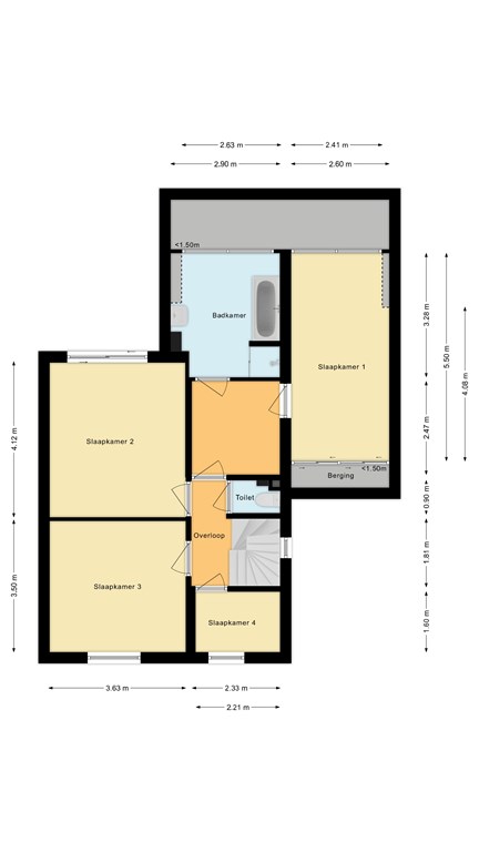 Overloop (9 m²) met toegang tot vier slaapkamers (15 m², 14 m², 13 m² en 4 m²). De badkamer (10 m²) biedt, door de toegepaste dakkapel, veel licht en ruimte en beschikt over een ligbad, een douche en een wastafelmeubel. Ook bevindt zich op deze verdieping een separate toilet.