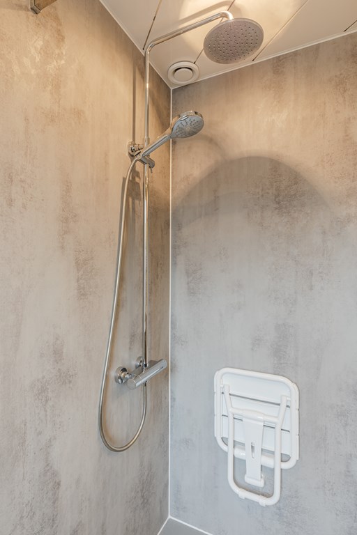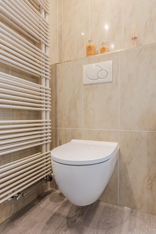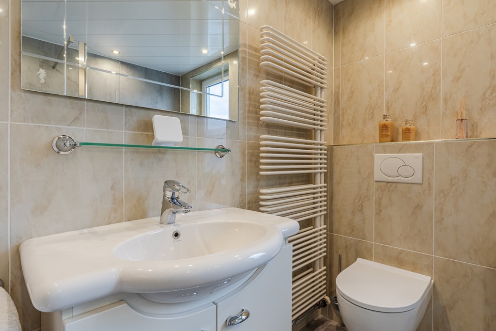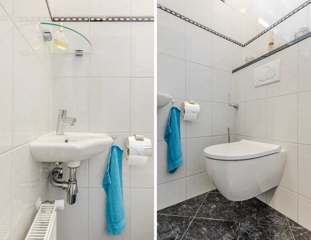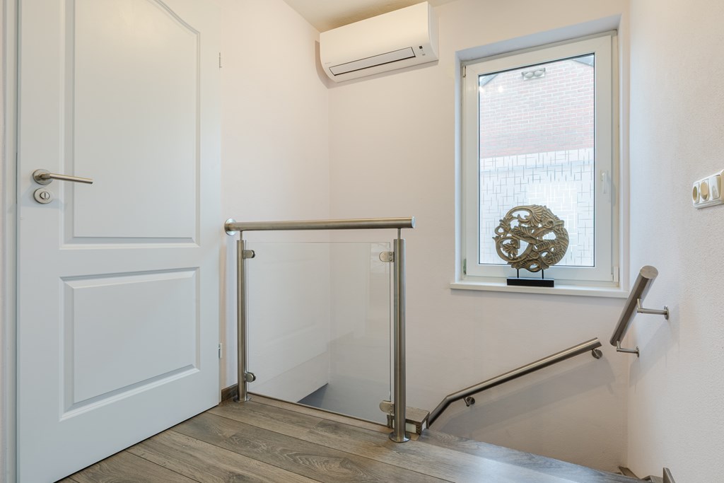 Overloop met airconditioning, 3 slaapkamers (13 m², 12 m² en 9 m²) met laminaatvloer, moderne badkamer (6 m²) met inloopdouche, wastafel met meubel en een zwevend toilet.
