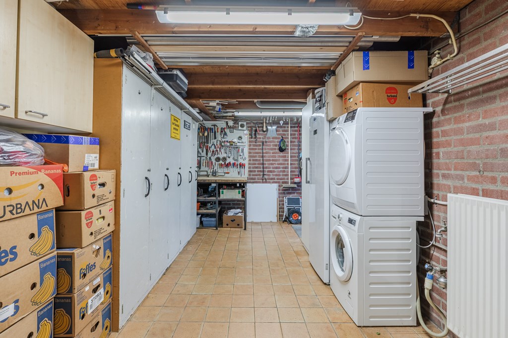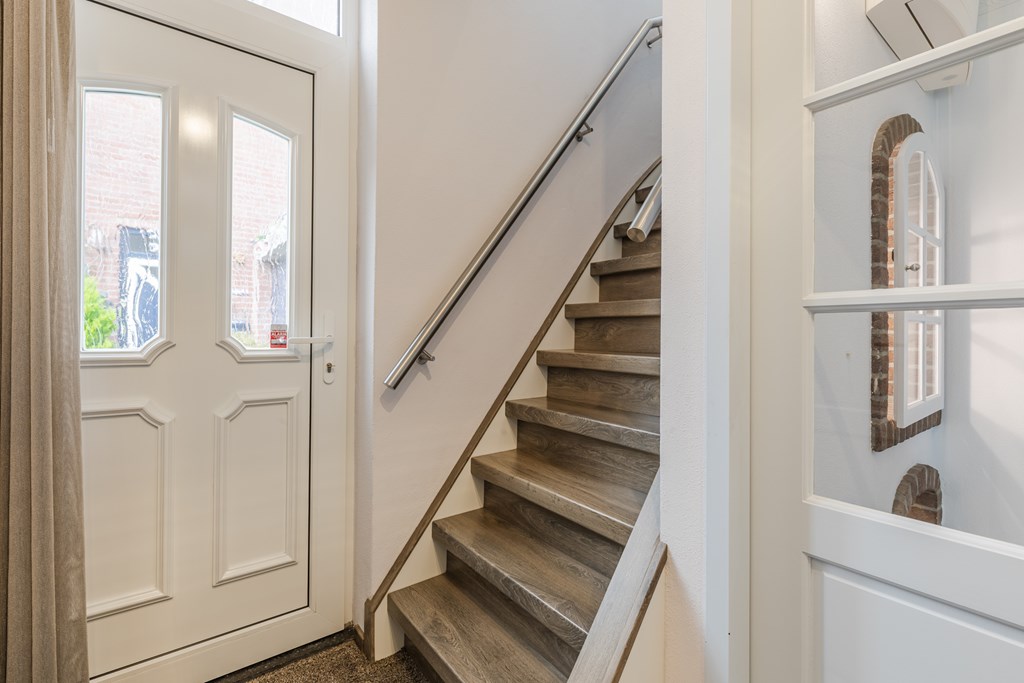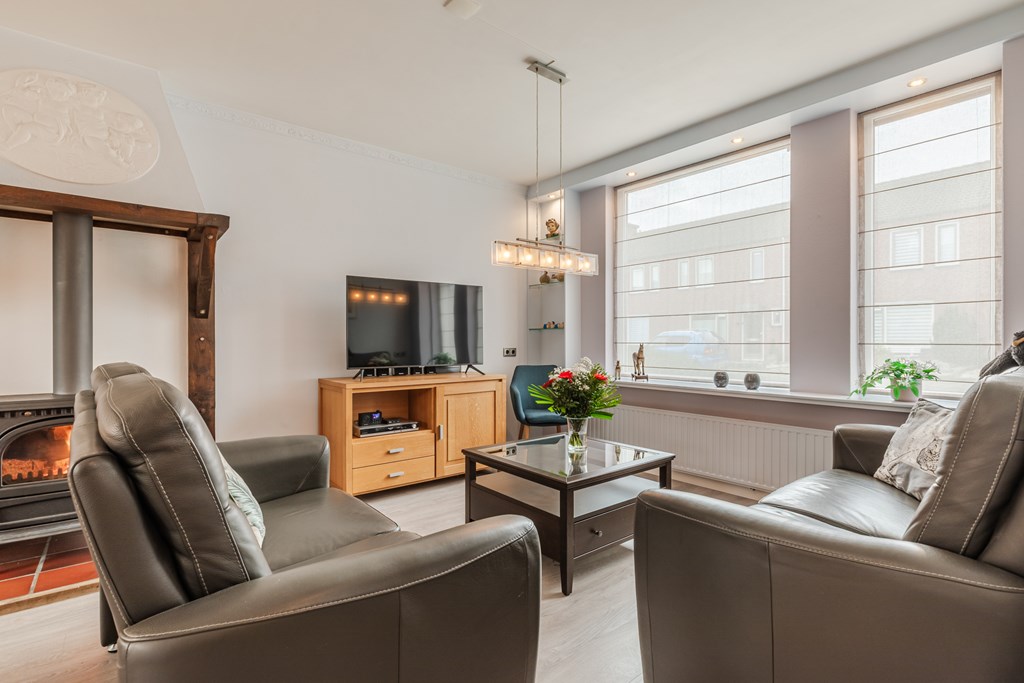 Hal, zwevend toilet met fonteintje, sfeervolle woonkamer (28 m²) met een moderne pvc vloer en houtkachel, open keuken (6 m²) met een complete inbouwkeuken v.v. een kookplaat, afzuigkap, combi magnetron, koelkast en vaatwasser, royale tuinkamer (24 m²) met tegelvloer en schuifpui, inpandige garage (17 m²) met verwarming en aansluiting voor wasmachine.