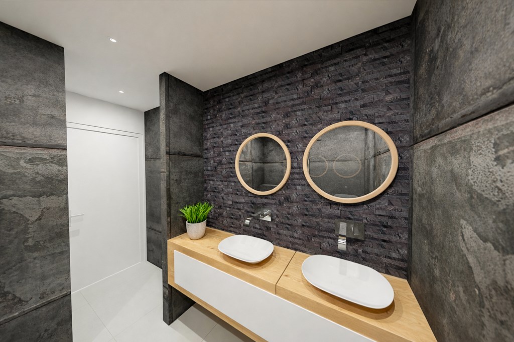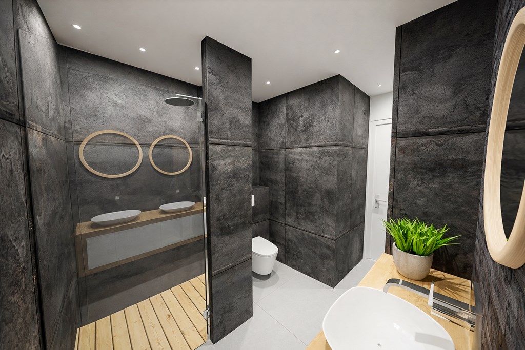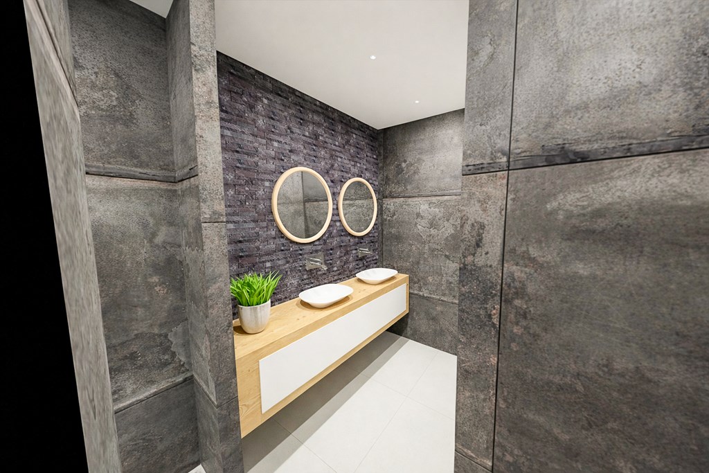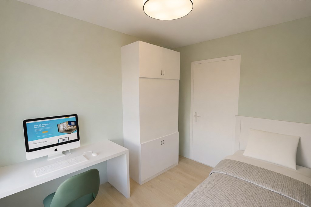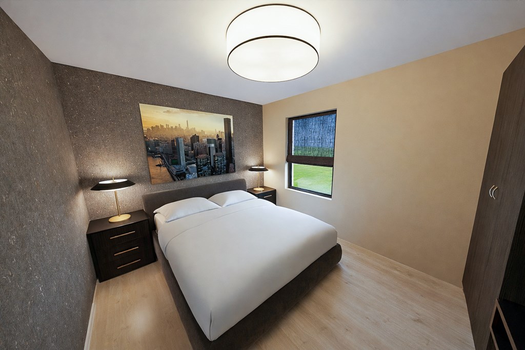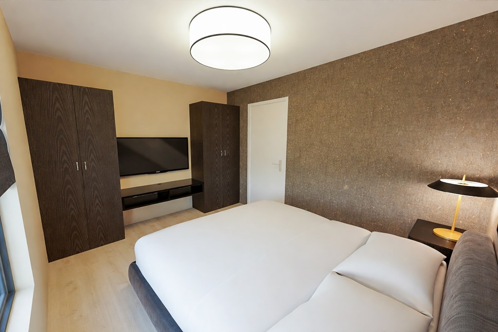 De hal geeft verder toegang tot twee slaapkamers (13 m² en 8 m²) en de badkamer (7 m²), standaard voorzien van een inloopdouche en dubbele wastafel.