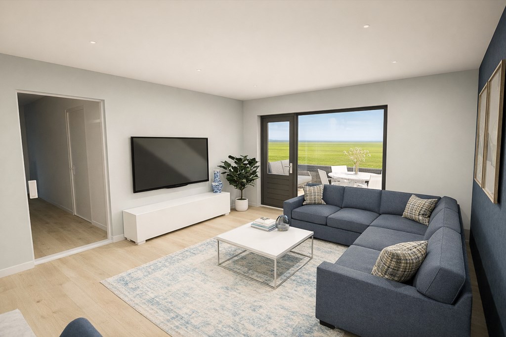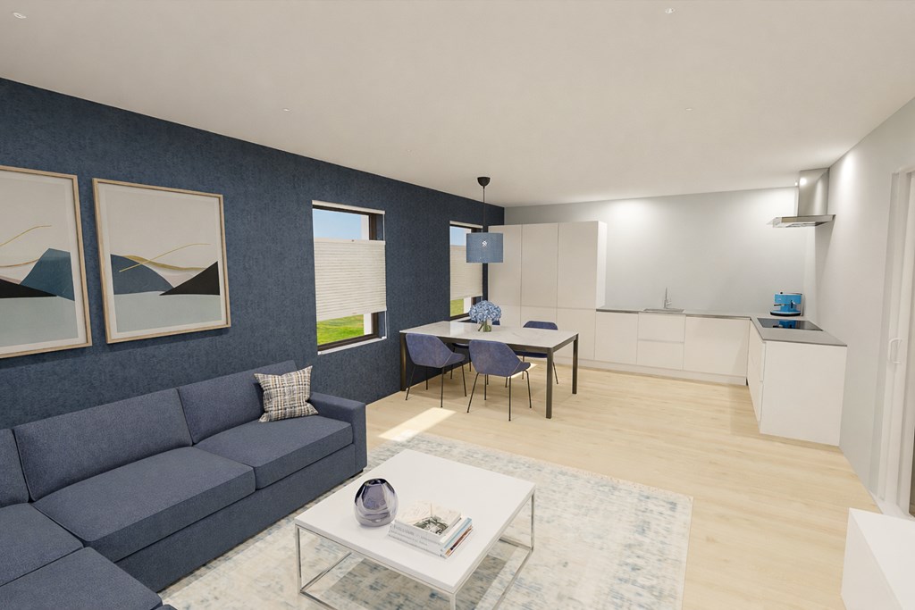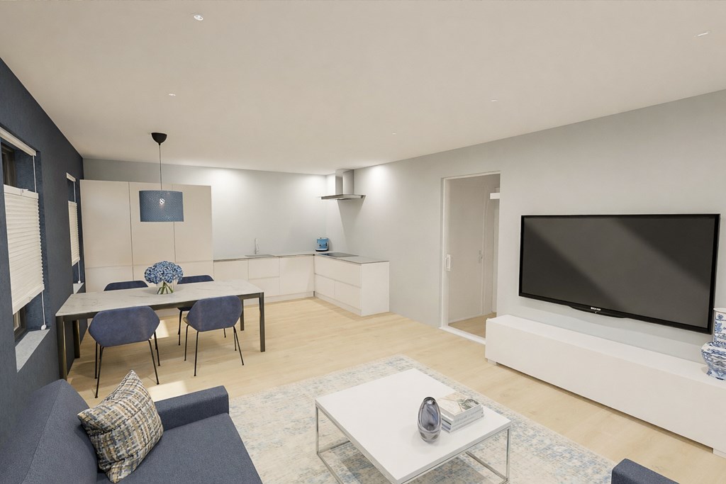 De woonkamer met open keuken (34 m²) vormt het hart van het appartement. Dankzij de grote raampartijen geniet deze ruimte van veel natuurlijk licht en een prettig open woongevoel.