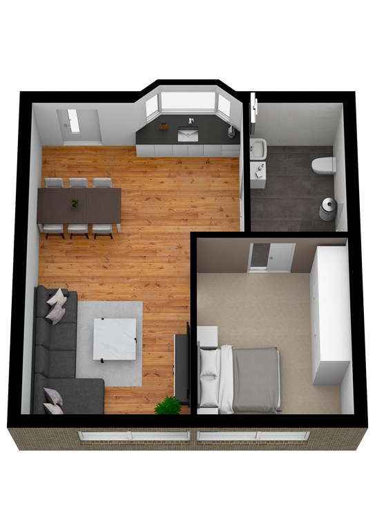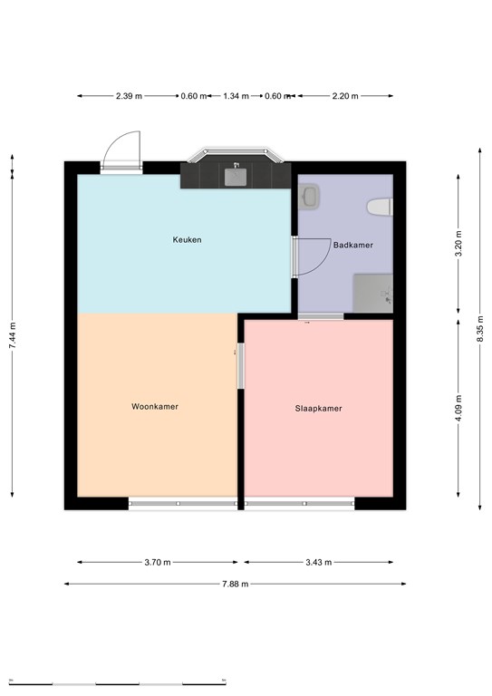 Woonkamer met open keuken ca. 31 m², ruime slaapkamer (14 m²) en badkamer (7 m²) v.v. inloopdouche, wastafel en mogelijkheid voor plaatsing wasmachine.