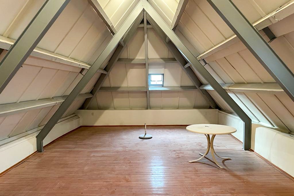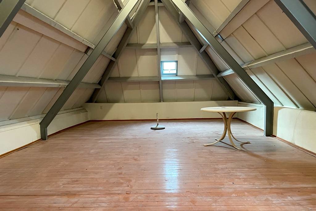 Overloop, slaapkamer (18 m²), 2 bergingen en een fraaie hobbyruimte/zolder (36 m²) met plankenvloer.