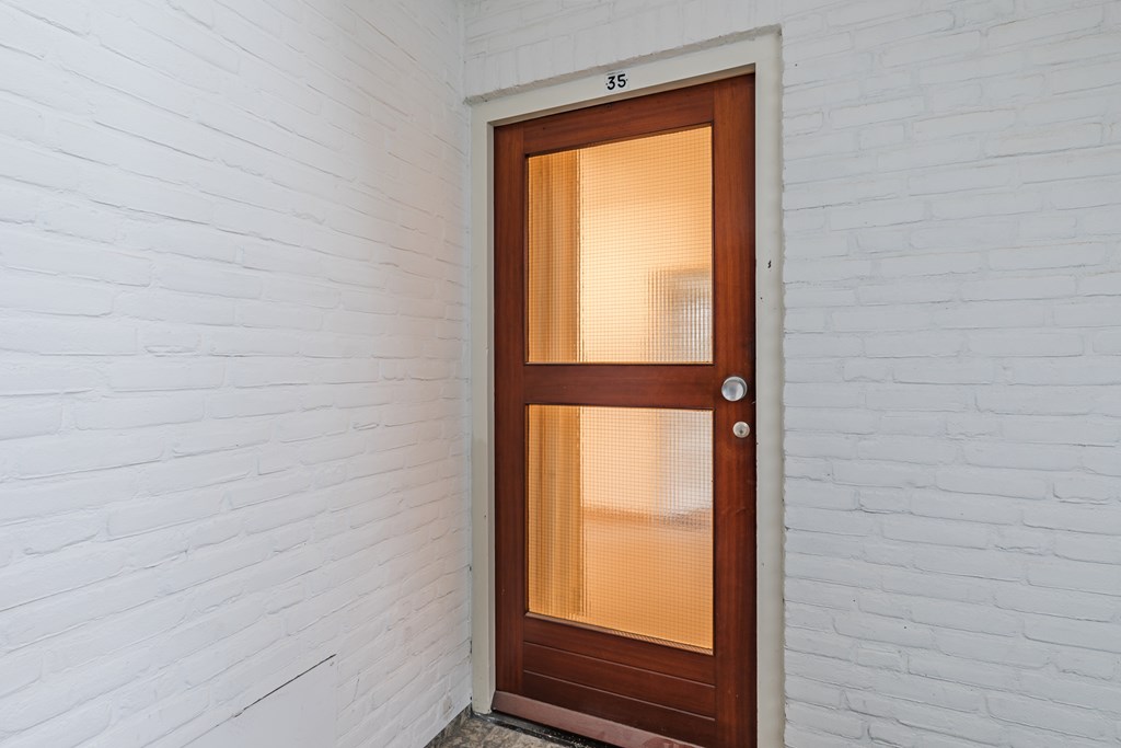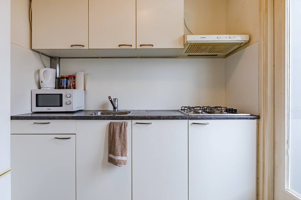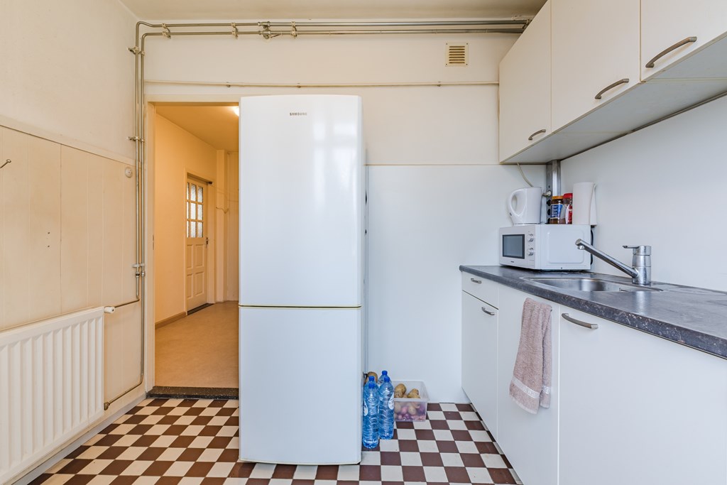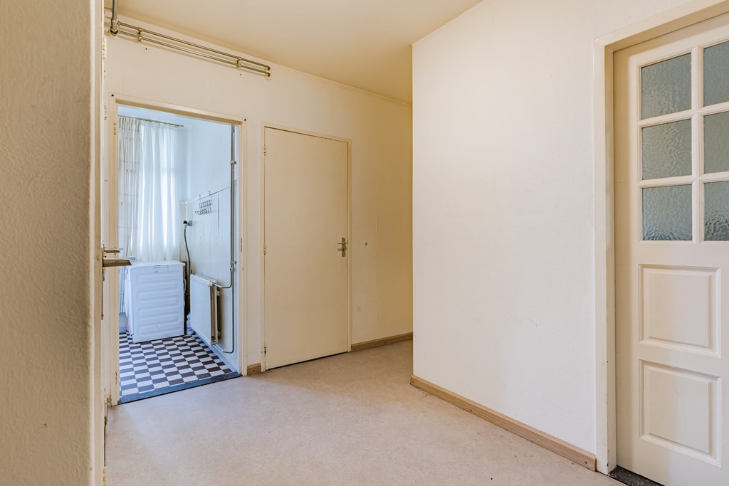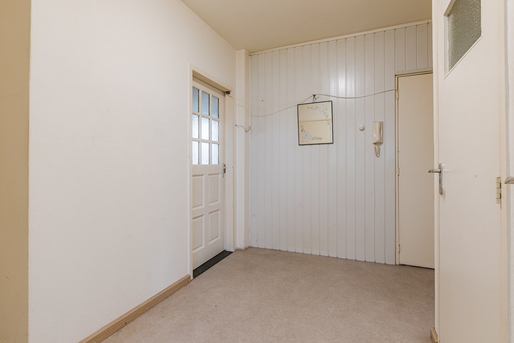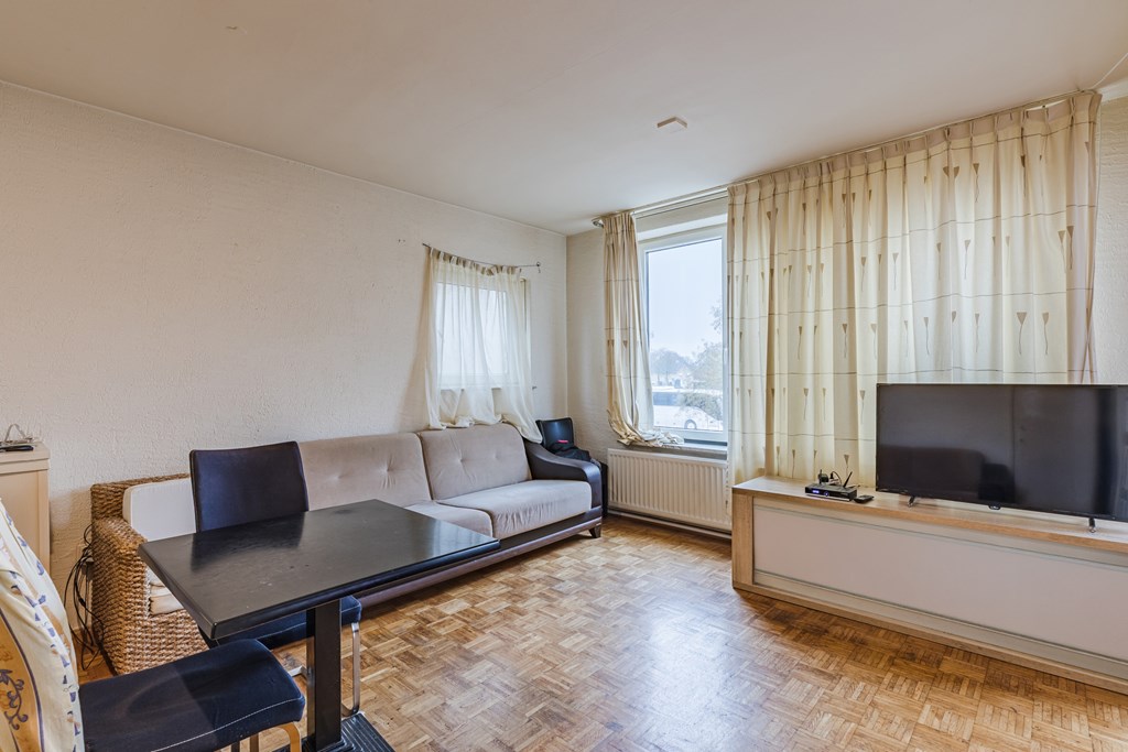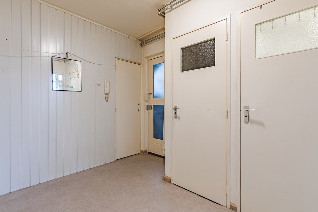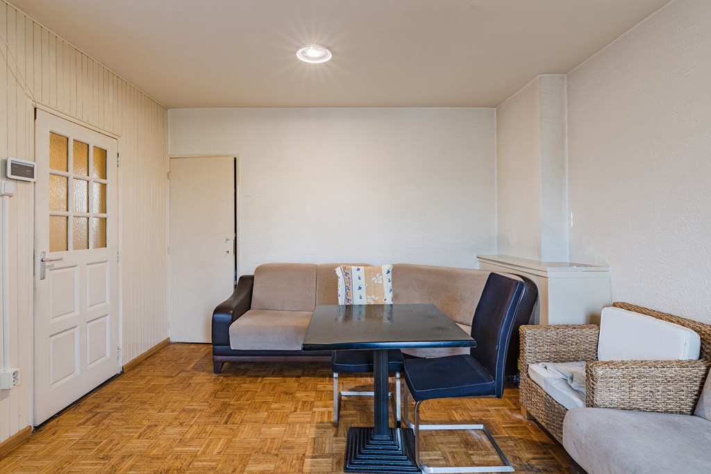 Via de entree/hal (8 m²) zijn alle vertrekken bereikbaar. De woonkamer (27 m²) is prettig van formaat en heeft dankzij de grote raampartijen een goede lichtinval, met voldoende ruimte voor een zit- en eethoek. De gesloten keuken (6 m²) is eenvoudig en praktisch ingericht en voorzien van een gaskookplaat, afzuigkap en wasmachineaansluiting. Vanuit de keuken is het balkon bereikbaar.