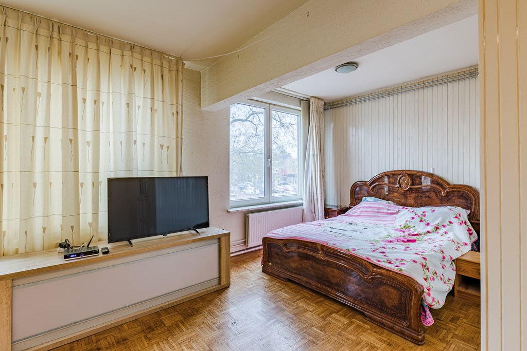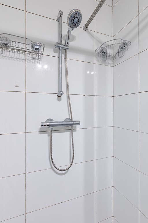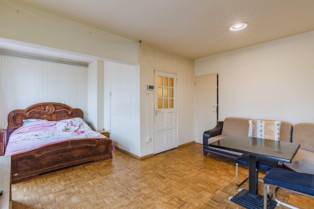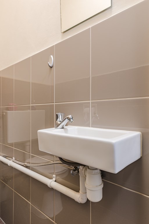 De badkamer (3 m²) is compact en uitgerust met een douche en wastafel. Het toilet is separaat. Het appartement beschikt over twee slaapkamers (13 m² en 5 m²), beide gelegen aan de rustige achterzijde. De kleinere kamer is zeer geschikt als kinder-, werk- of logeerkamer.