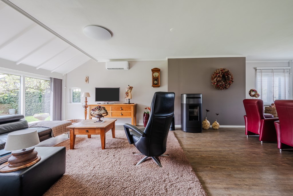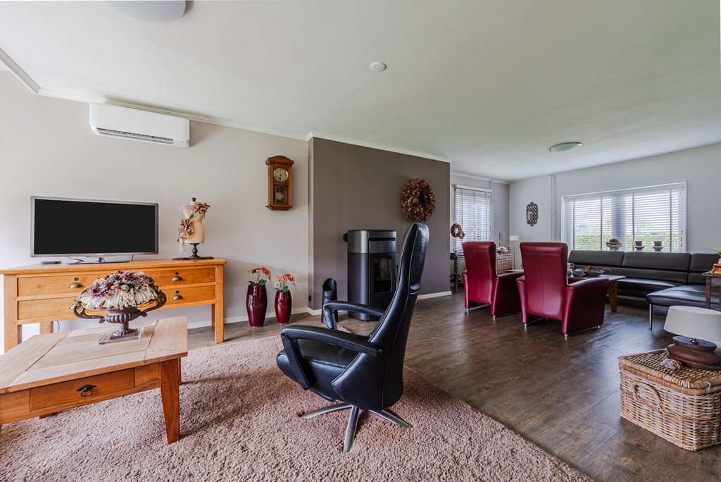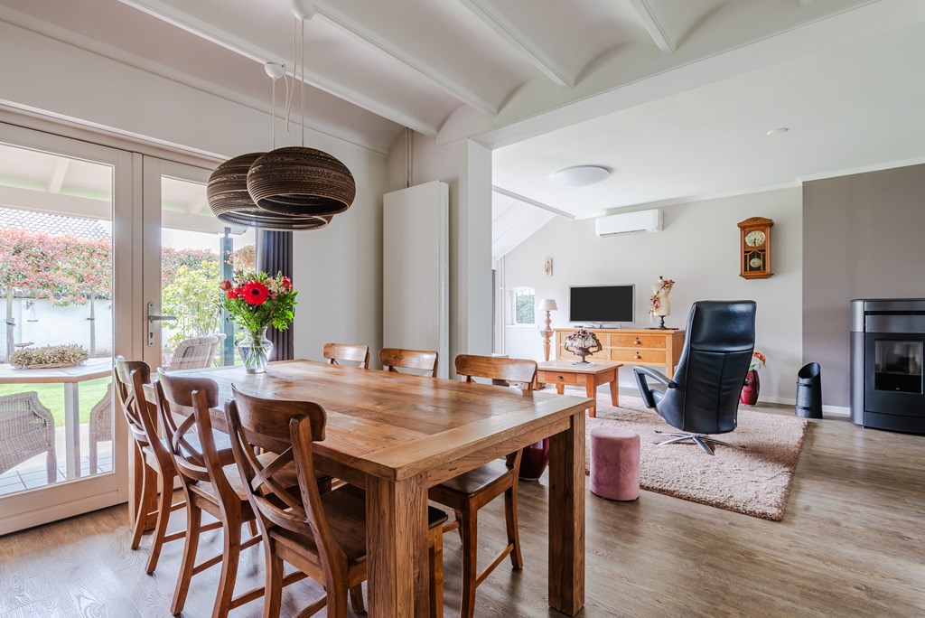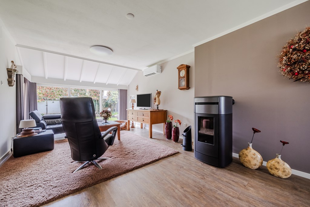 De woonkamer met eetkamer (53 m²) is uitgevoerd als lichte doorzonruimte met een T-vormige opzet, voorzien van airconditioning en een sfeervolle pelletkachel. De open verbinding zorgt voor een fijne, ruime leefomgeving met veel lichtinval.