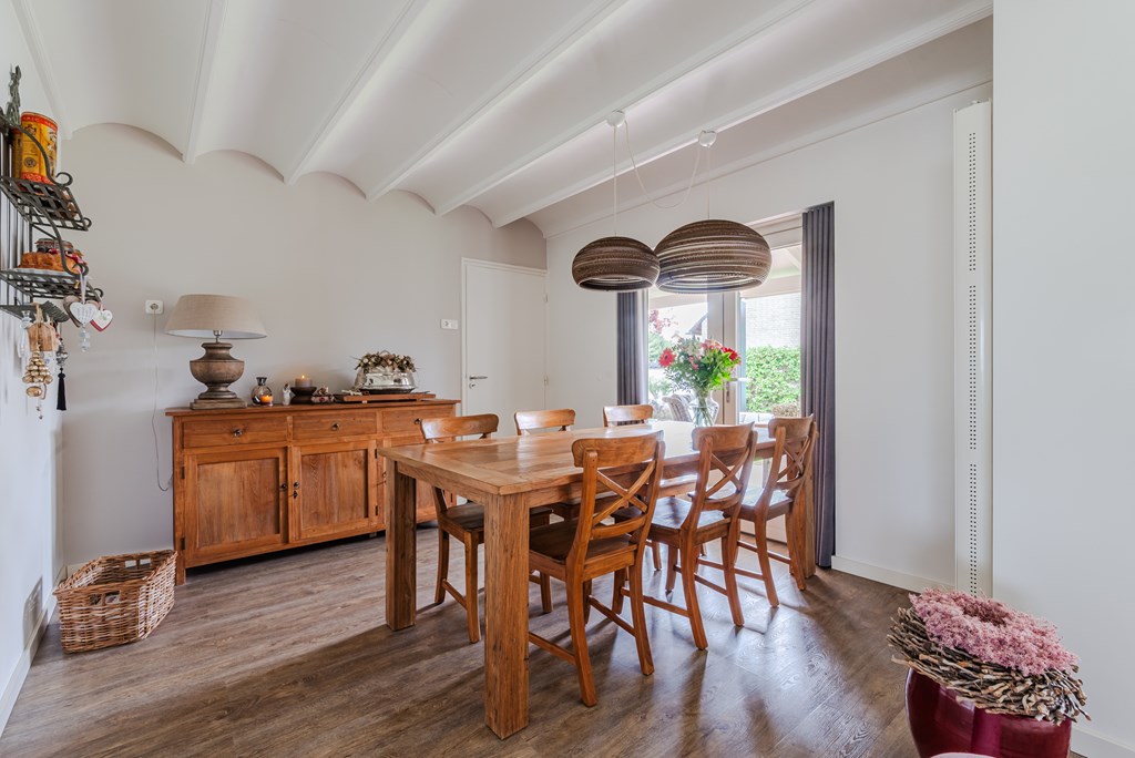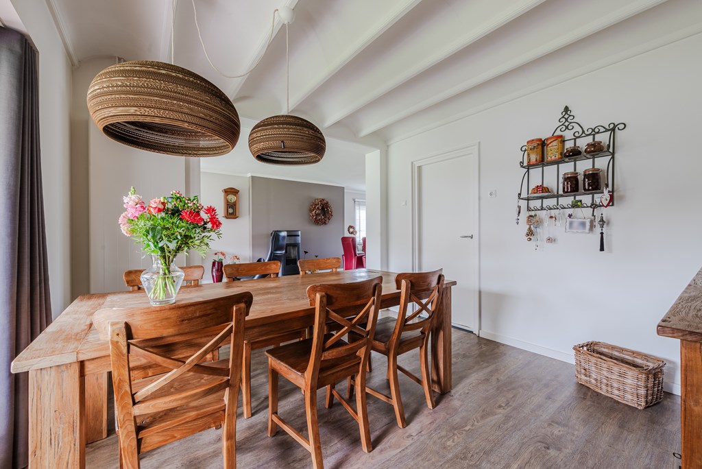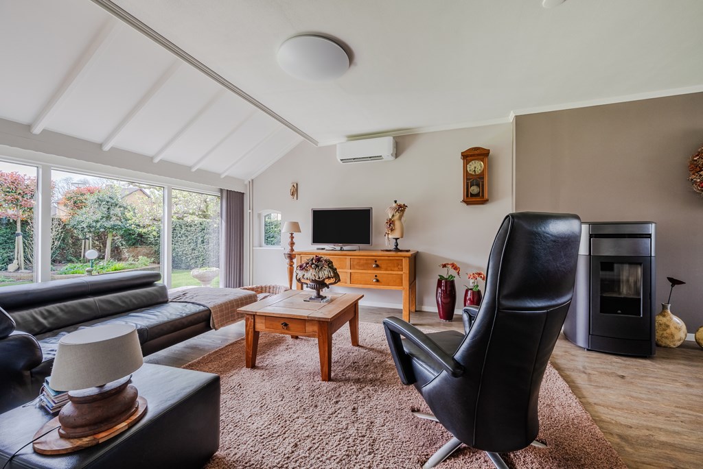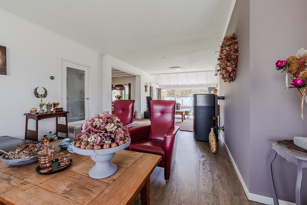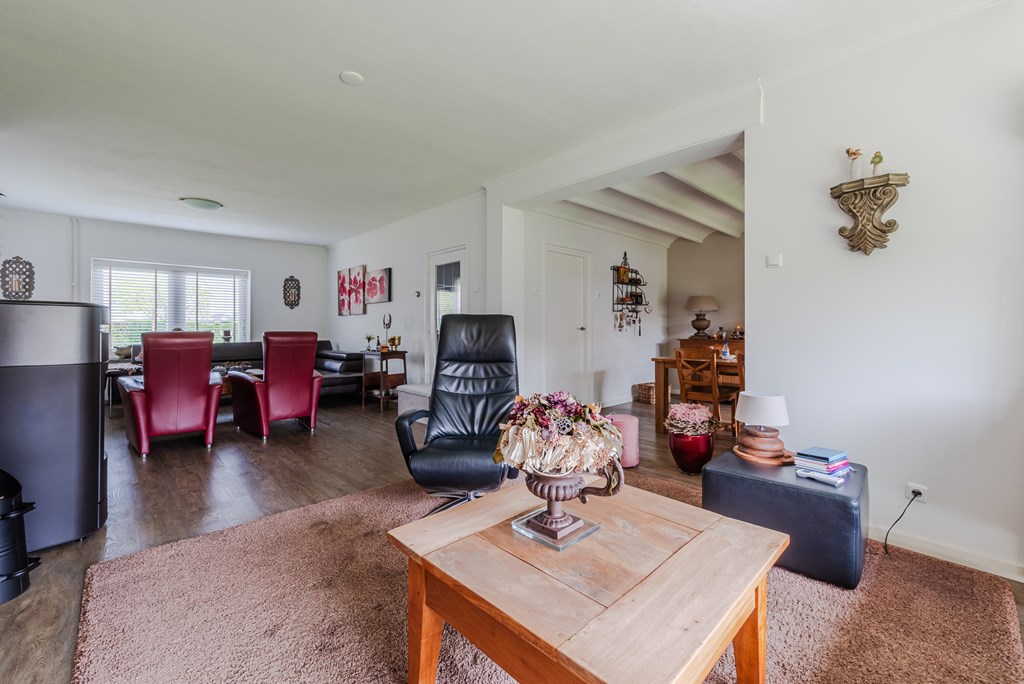 De woonkamer met eetkamer (53 m²) is uitgevoerd als lichte doorzonruimte met een T-vormige opzet, voorzien van airconditioning en een sfeervolle pelletkachel. De open verbinding zorgt voor een fijne, ruime leefomgeving met veel lichtinval.