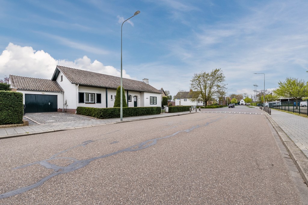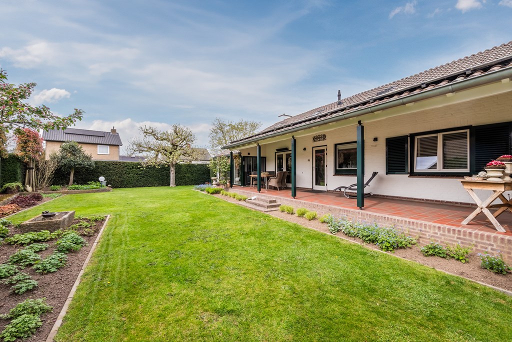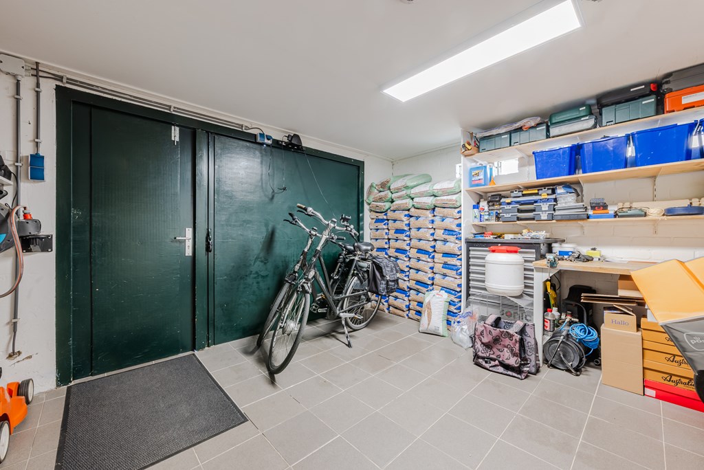 De buitenruimte is verrassend compleet en praktisch ingericht. Er is een garage aanwezig (15 m²), een separate berging (14 m²) en een tuinberging (5 m²). Daarnaast beschikt de woning over een overkapping (28 m²) en een oprit aan de zijkant.