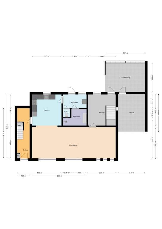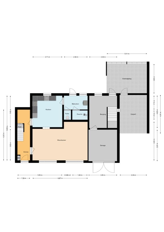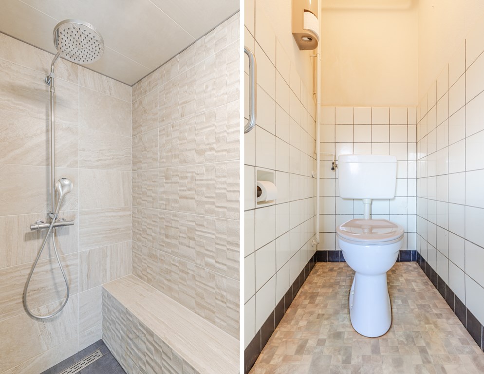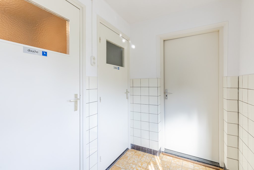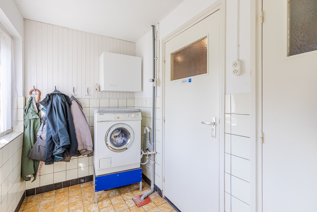 Aansluitend ligt de bijkeuken (5 m²) met witgoedaansluitingen, toegang tot de badkamer met douche en het separate toilet.