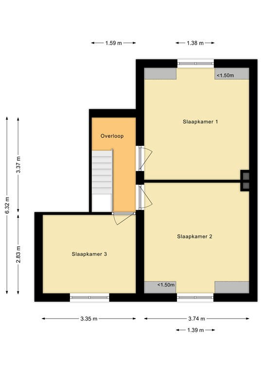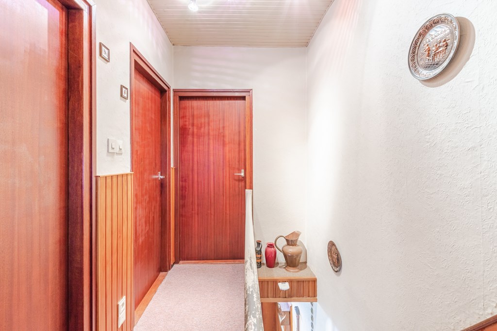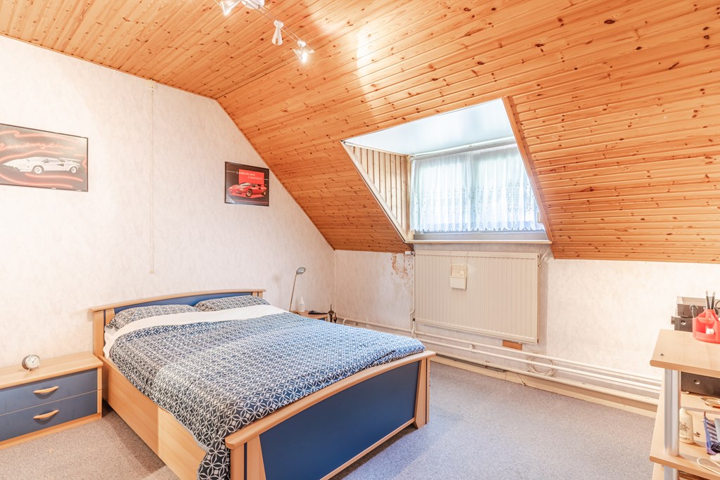 Overloop met drie slaapkamers (14 m², 14 m² en 9 m²), waarvan twee met een dakkapel. Eén dakkapel is aan vervanging of reparatie toe en biedt direct de kans om voor een groter of energiezuiniger model te kiezen.