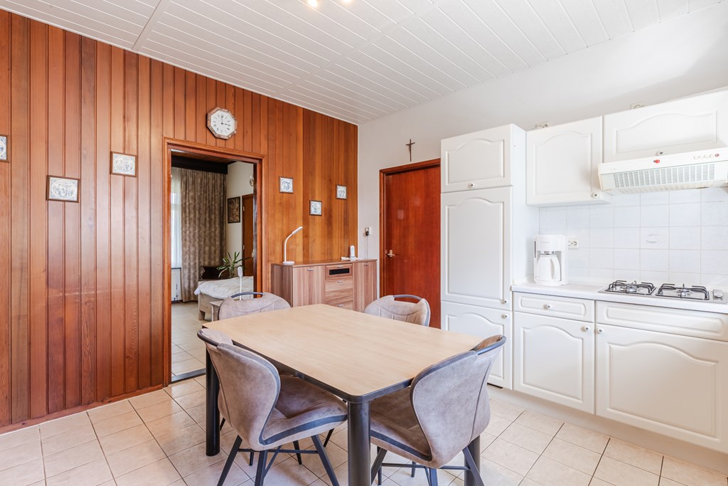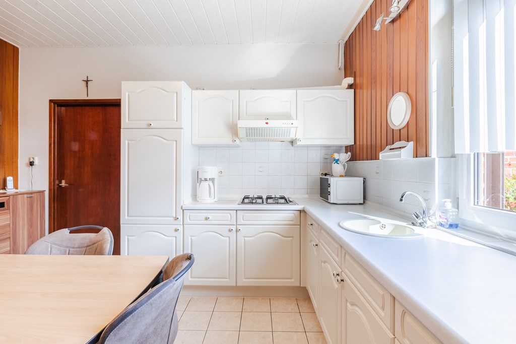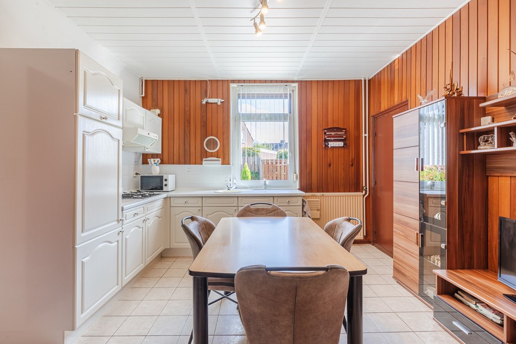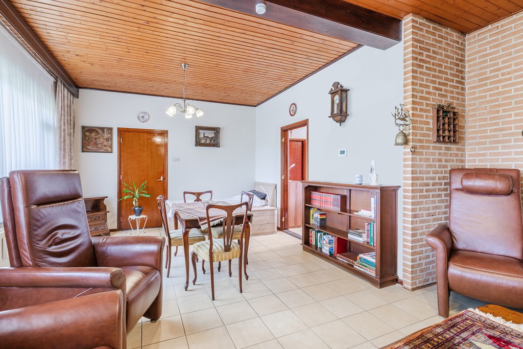 Ruime entreehal (10 m²) met trapopgang en meterkast. Toegang tot de gesloten keuken (15 m²) met gaskookplaat, afzuigkap en koelkast. De keuken staat in verbinding met de L-vormige woonkamer, afgewerkt met een tegelvloer en voorzien van prettig daglicht.