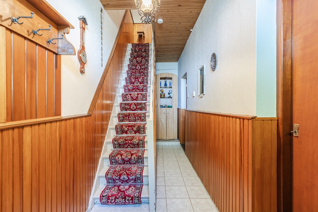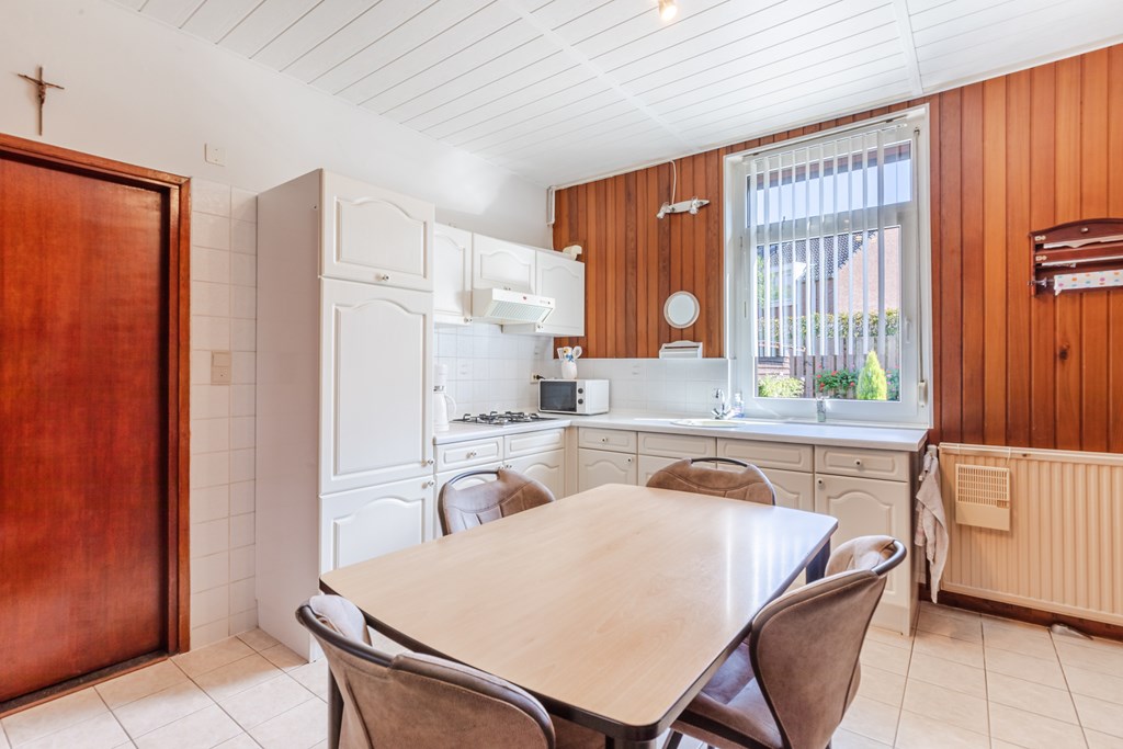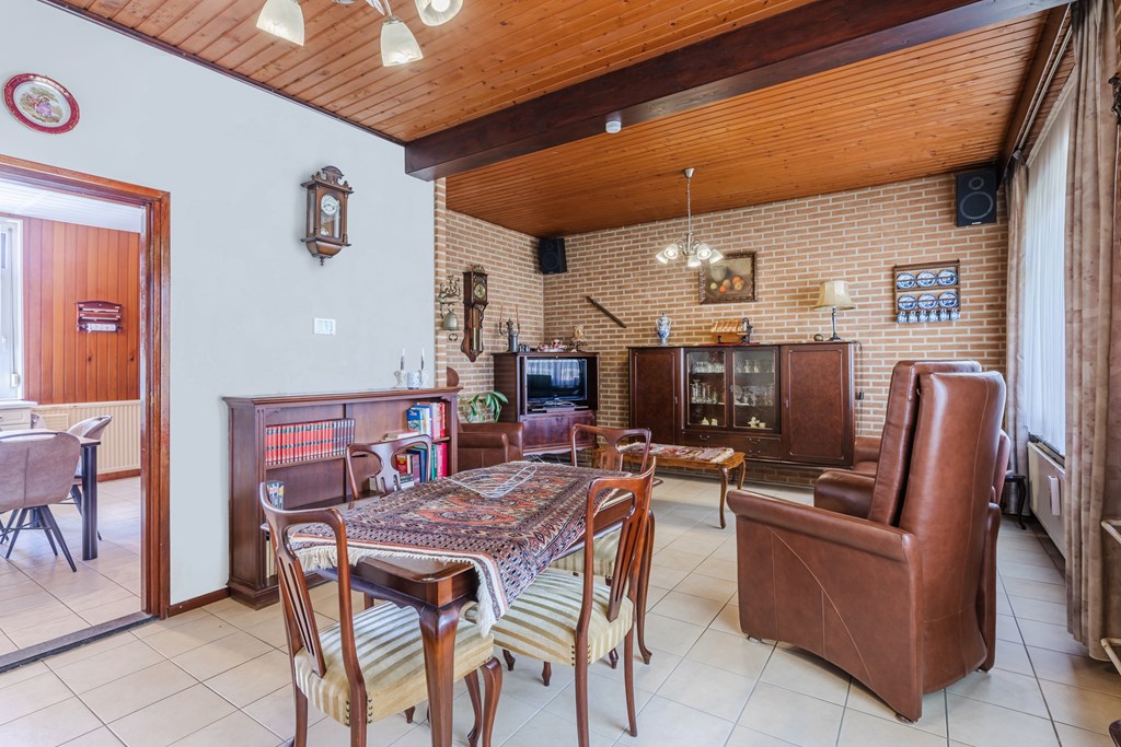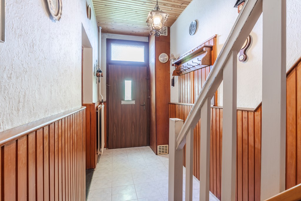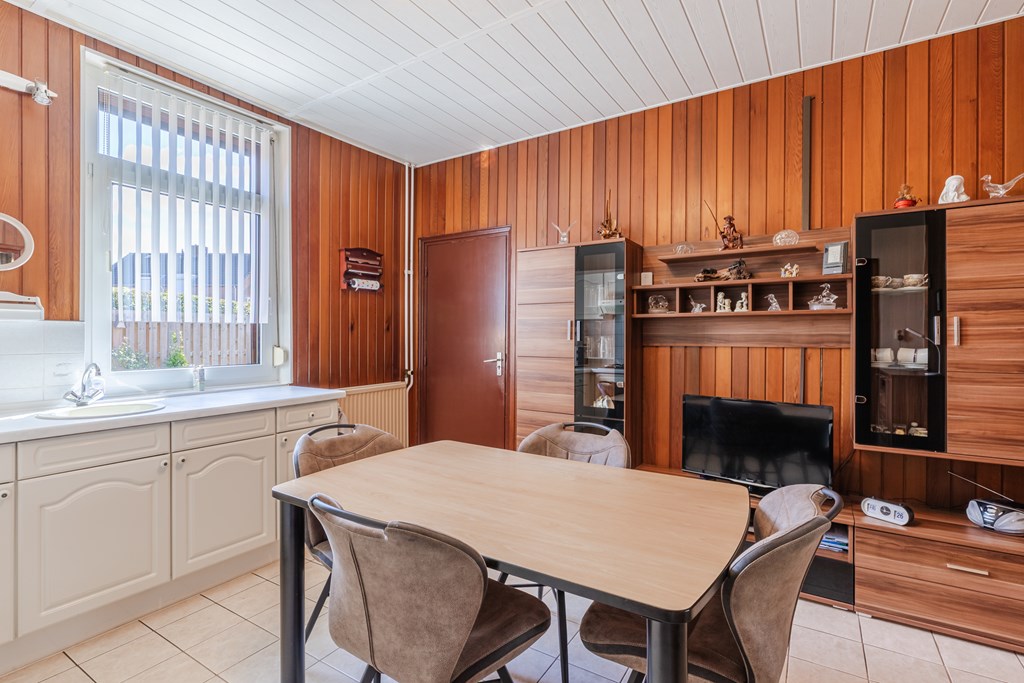 Ruime entreehal (10 m²) met trapopgang en meterkast. Toegang tot de gesloten keuken (15 m²) met gaskookplaat, afzuigkap en koelkast. De keuken staat in verbinding met de L-vormige woonkamer, afgewerkt met een tegelvloer en voorzien van prettig daglicht.